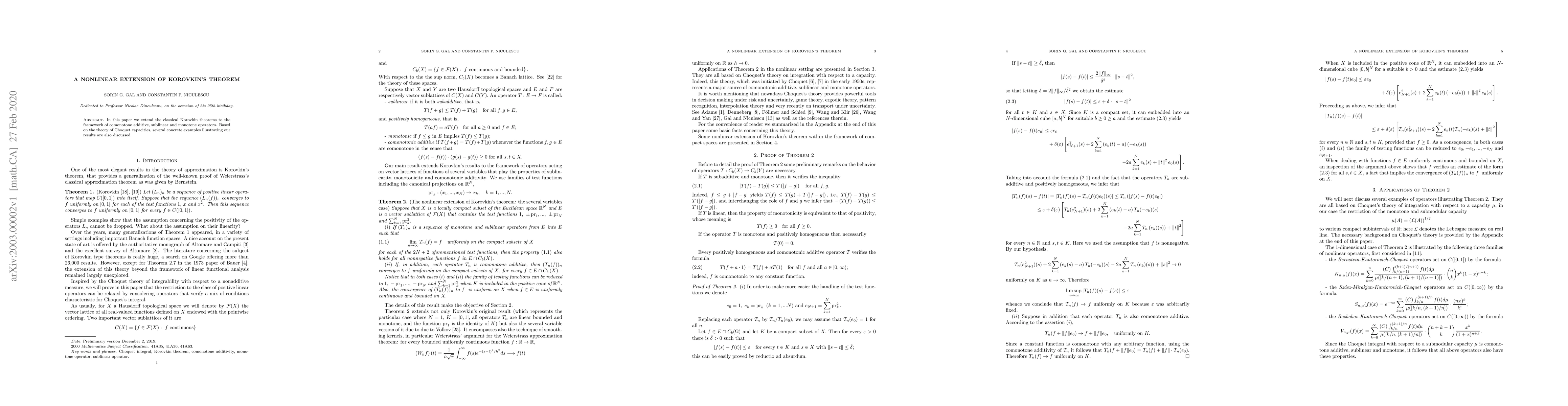 In this paper we extend the classical Korovkin theorems to the framework of comonotone additive, sublinear and monotone operators. Based on the theory of Choquet capacities, several concrete examples illustrating our results are also discussed.