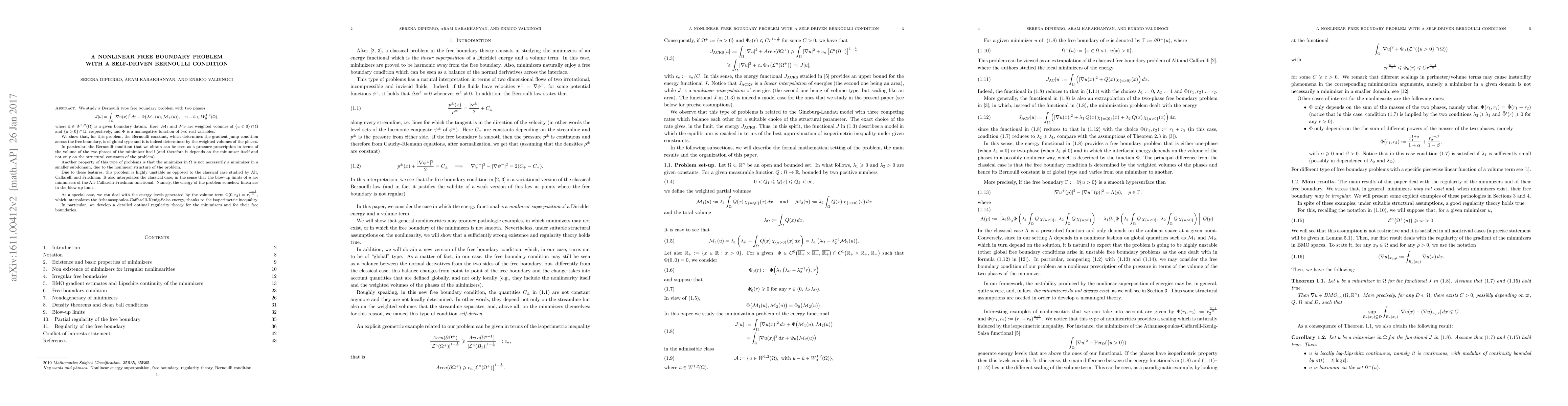 We study a Bernoulli type free boundary problem with two phases $$J[u]=\int_{\Omega}|\nabla u(x)|^2\,dx+\Phi\big({\mathcal M}_-(u), {\mathcal{M}}_+(u)\big), \quad u-\bar u\in W^{1,2}_0(\Omega), $$ where $\bar u\in W^{1,2}(\Omega)$ is a given boundary datum. Here, ${\mathcal M}_1$ and ${\mathcal M}_2$ are weighted volumes of $\{u\le 0\}\cap \Omega$ and $\{u>0\}\cap \Omega$, respectively, and $\Phi$ is a nonnegative function of two real variables. We show that, for this problem, the Bernoulli constant, which determines the gradient jump condition across the free boundary, is of global type and it is indeed determined by the weighted volumes of the phases. In particular, the Bernoulli condition that we obtain can be seen as a pressure prescription in terms of the volume of the two phases of the minimizer itself (and therefore it depends on the minimizer itself and not only on the structural constants of the problem). Another property of this type of problems is that the minimizer in $\Omega$ is not necessarily a minimizer in a smaller subdomain, due to the nonlinear structure of the problem. Due to these features, this problem is highly unstable as opposed to the classical case studied by Alt, Caffarelli and Friedman. It also interpolates the classical case, in the sense that the blow-up limits of $u$ are minimizers of the Alt-Caffarelli-Friedman functional. Namely, the energy of the problem somehow linearizes in the blow-up limit. As a special case, we can deal with the energy levels generated by the volume term $\Phi(0, r_2)=r_2^{\frac{n-1}n}$, which interpolates the Athanasopoulos-Caffarelli-Kenig-Salsa energy, thanks to the isoperimetric inequality. In particular, we develop a detailed optimal regularity theory for the minimizers and for their free boundaries.