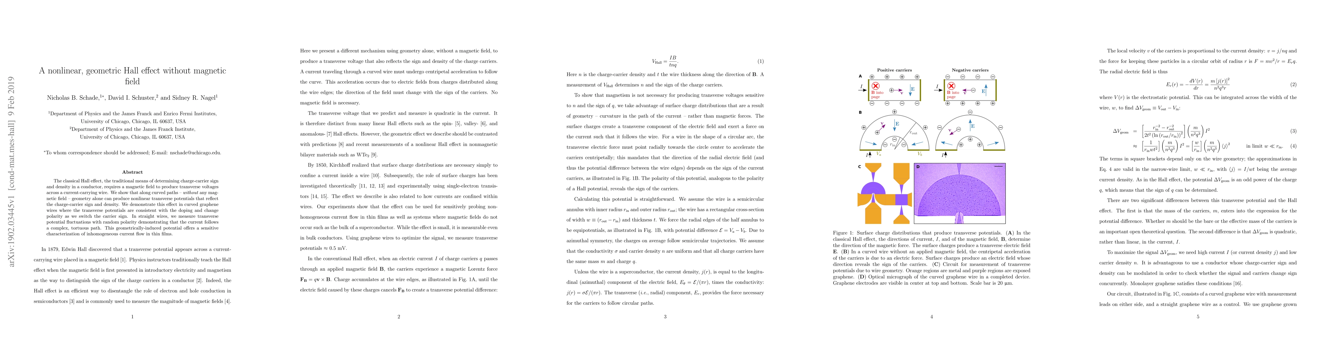 The classical Hall effect, the traditional means of determining charge-carrier sign and density in a conductor, requires a magnetic field to produce transverse voltages across a current-carrying wire. We show that along curved paths -- $\mathrm{\textit{without}}$ any magnetic field -- geometry alone can produce nonlinear transverse potentials that reflect the charge-carrier sign and density. We demonstrate this effect in curved graphene wires where the transverse potentials are consistent with the doping and change polarity as we switch the carrier sign. In straight wires, we measure transverse potential fluctuations with random polarity demonstrating that the current follows a complex, tortuous path. This geometrically-induced potential offers a sensitive characterization of inhomogeneous current flow in thin films.