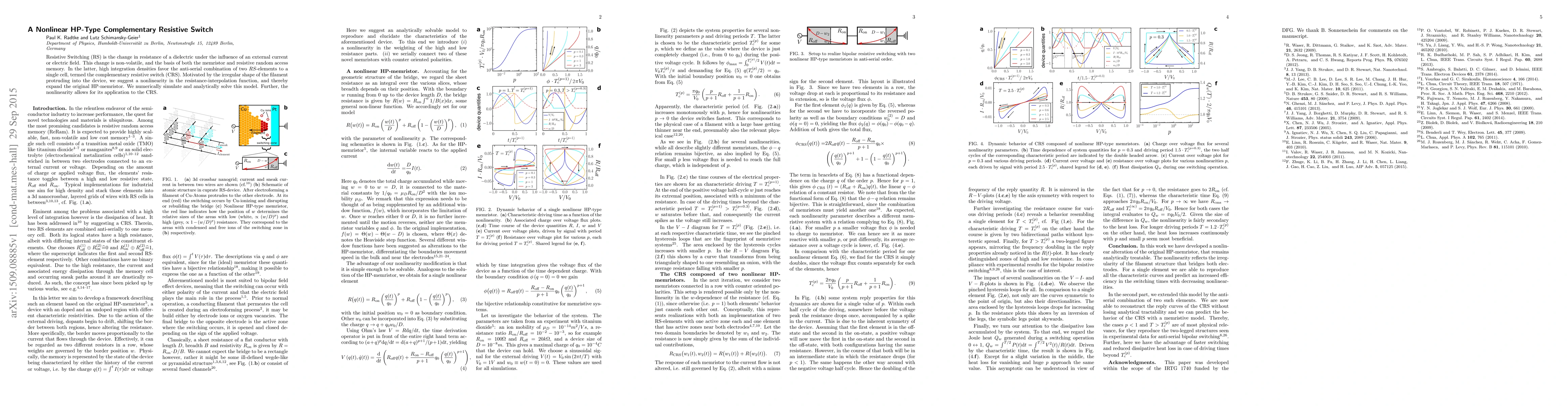 This paper proposes a nonlinear HP-type resistive switch model based on the irregular filament shape in the device, expanding the original HP-memristor model. The authors provide numerical simulations and analytical solutions for this model, demonstrating its applicability to complementary resistive switches.