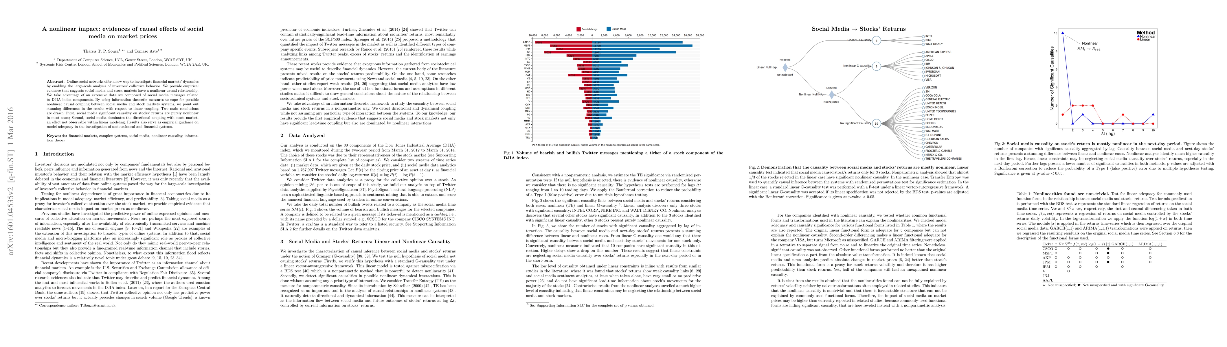 This paper investigates the nonlinear causal relationship between social media and stock market prices using DJIA index components. It finds that social media significantly influences stock returns in a nonlinear manner, with a dominant directional coupling effect not captured by linear models.