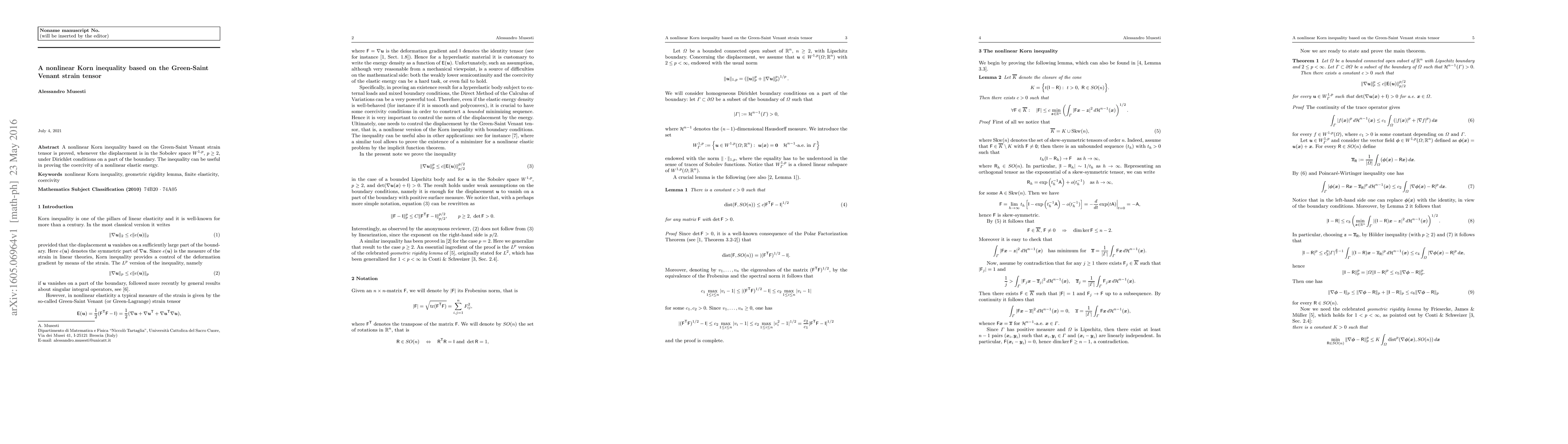 This paper proves a nonlinear Korn inequality using the Green-Saint Venant strain tensor for displacements in the Sobolev space $W^{1,p}$ with $p\geq 2$, under Dirichlet boundary conditions. This inequality aids in demonstrating the coercivity of nonlinear elastic energy.