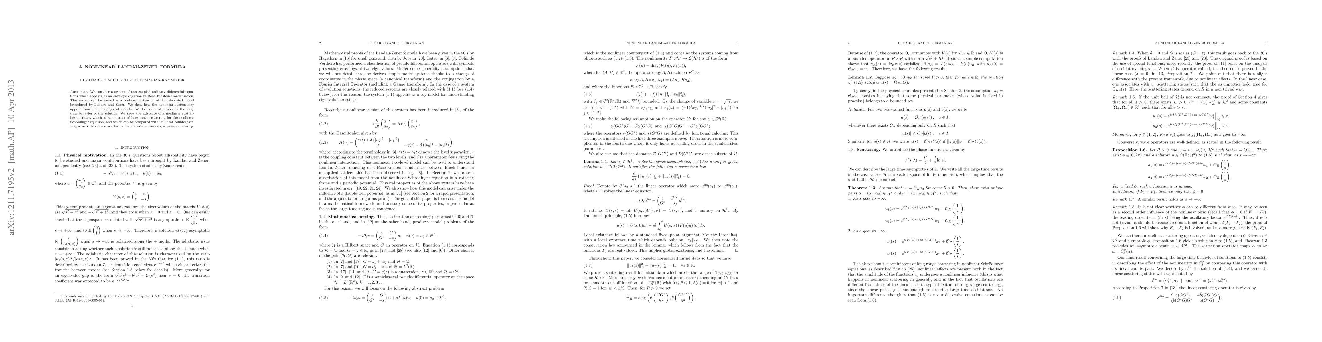 We consider a system of two coupled ordinary differential equations which appears as an envelope equation in Bose-Einstein Condensation. This system can be viewed as a nonlinear extension of the celebrated model introduced by Landau and Zener. We show how the nonlinear system may appear from different physical models. We focus our attention on the large time behavior of the solution. We show the existence of a nonlinear scattering operator, which is reminiscent of long range scattering for the nonlinear Schrodinger equation, and which can be compared with its linear counterpart.