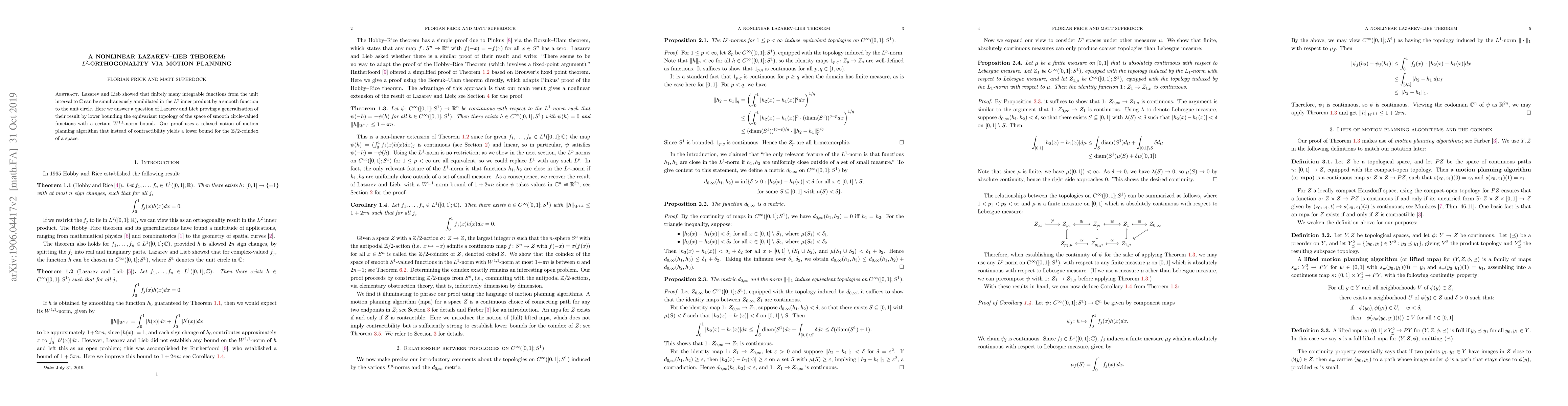 Lazarev and Lieb showed that finitely many integrable functions from the unit interval to $\mathbb{C}$ can be simultaneously annihilated in the $L^2$ inner product by a smooth function to the unit circle. Here we answer a question of Lazarev and Lieb proving a generalization of their result by lower bounding the equivariant topology of the space of smooth circle-valued functions with a certain $W^{1,1}$-norm bound. Our proof uses a relaxed notion of motion planning algorithm that instead of contractibility yields a lower bound for the $\mathbb{Z}/2$-coindex of a space.
