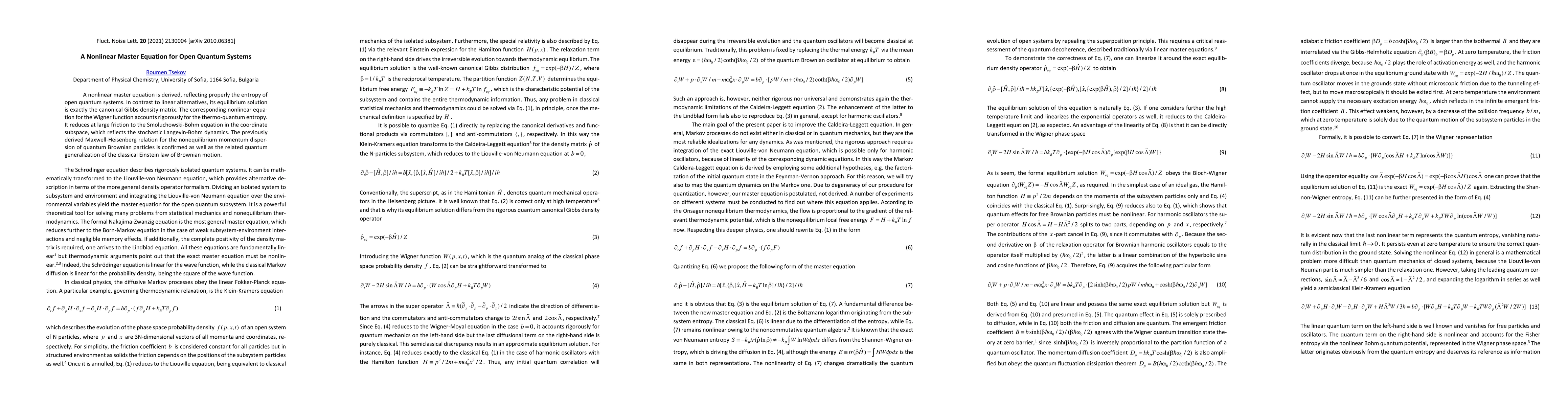 A nonlinear master equation is derived, reflecting properly the entropy of open quantum systems. In contrast to linear alternatives, its equilibrium solution is exactly the canonical Gibbs density matrix. The corresponding nonlinear equation for the Wigner function accounts rigorously for the thermo-quantum entropy. It reduces at large friction to the Smoluchowski-Bohm equation in the coordinate subspace, which reflects the stochastic Langevin-Bohm dynamics. The previously derived Maxwell-Heisenberg relation for the nonequilibrium momentum dispersion of quantum Brownian particles is confirmed as well as the related quantum generalization of the classical Einstein law of Brownian motion.
