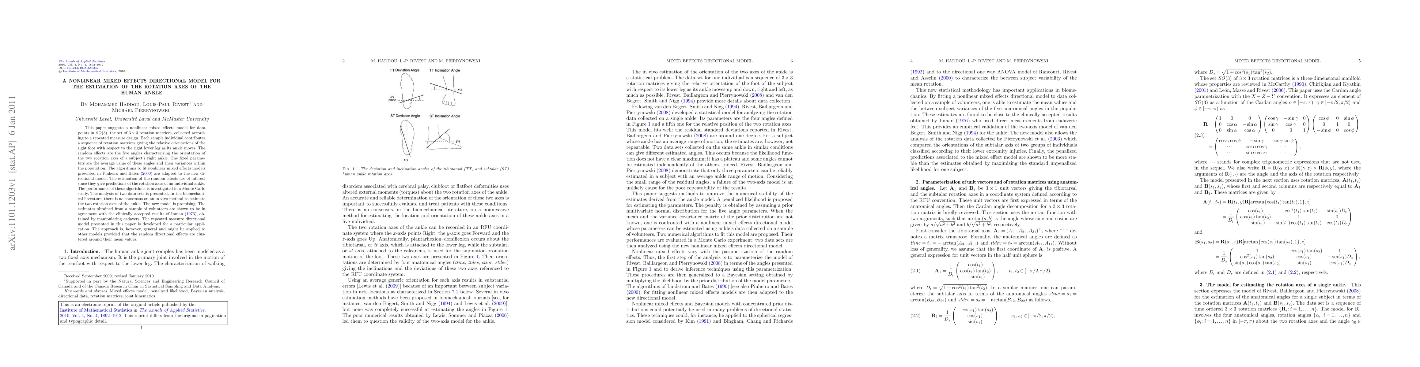 This paper suggests a nonlinear mixed effects model for data points in $\mathit{SO}(3)$, the set of $3\times3$ rotation matrices, collected according to a repeated measure design. Each sample individual contributes a sequence of rotation matrices giving the relative orientations of the right foot with respect to the right lower leg as its ankle moves. The random effects are the five angles characterizing the orientation of the two rotation axes of a subject's right ankle. The fixed parameters are the average value of these angles and their variances within the population. The algorithms to fit nonlinear mixed effects models presented in Pinheiro and Bates (2000) are adapted to the new directional model. The estimation of the random effects are of interest since they give predictions of the rotation axes of an individual ankle. The performance of these algorithms is investigated in a Monte Carlo study. The analysis of two data sets is presented. In the biomechanical literature, there is no consensus on an in vivo method to estimate the two rotation axes of the ankle. The new model is promising. The estimates obtained from a sample of volunteers are shown to be in agreement with the clinically accepted results of Inman (1976), obtained by manipulating cadavers. The repeated measure directional model presented in this paper is developed for a particular application. The approach is, however, general and might be applied to other models provided that the random directional effects are clustered around their mean values.