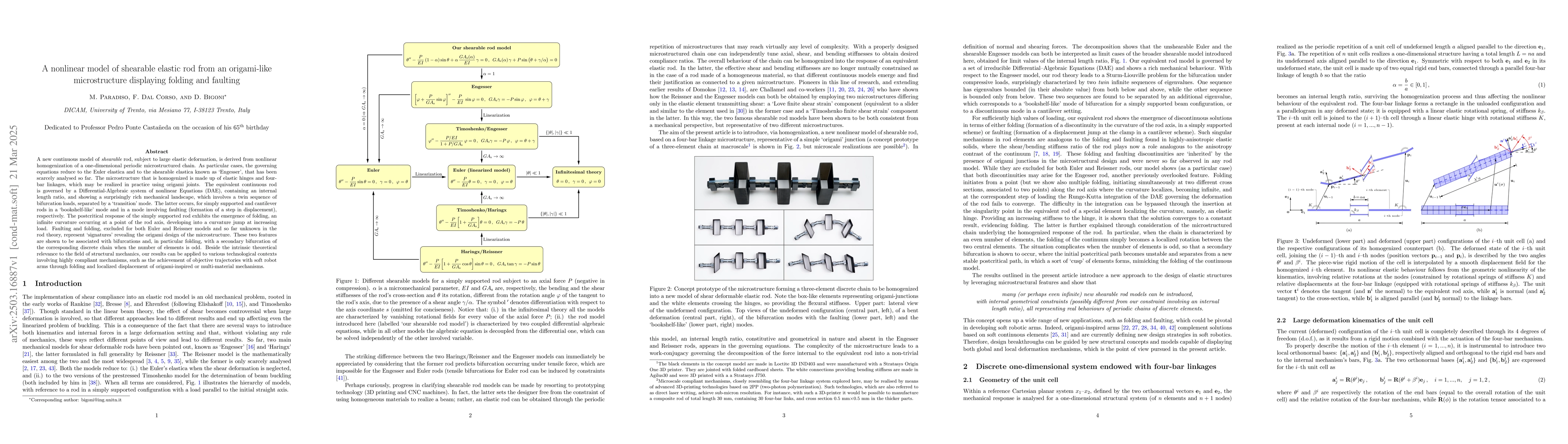The research derives a nonlinear model of a shearable elastic rod from homogenization of a one-dimensional periodic microstructured chain, incorporating elastic hinges and four-bar linkages, which can be practically realized using origami joints.