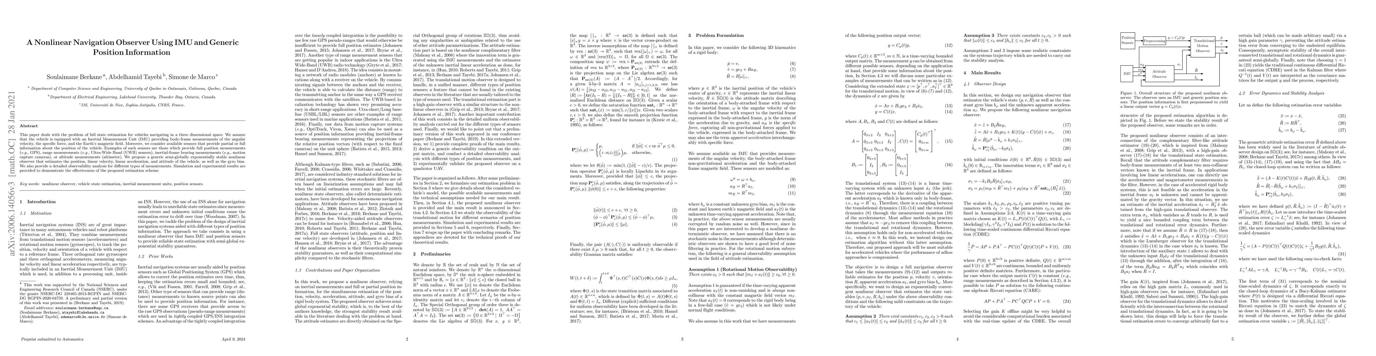 This paper proposes a nonlinear observer for full state estimation of vehicles using an IMU and various position sensors. The observer estimates position, velocity, acceleration, attitude, and gyro bias, demonstrating stability and effectiveness through simulations and experiments.