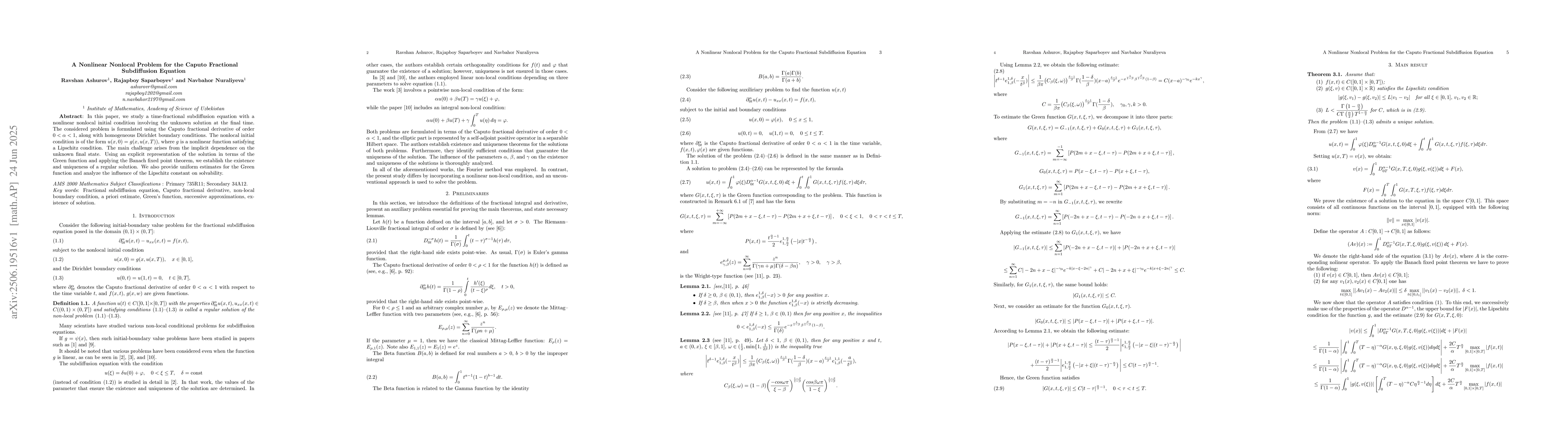 In this paper, we study a time-fractional subdiffusion equation with a nonlinear nonlocal initial condition involving the unknown solution at the final time. The considered problem is formulated using the Caputo fractional derivative of order \(0 < \alpha < 1\), along with homogeneous Dirichlet boundary conditions. The nonlocal initial condition is of the form \( u(x,0) = g(x, u(x,T)) \), where \(g\) is a nonlinear function satisfying a Lipschitz condition. The main challenge arises from the implicit dependence on the unknown final state. Using an explicit representation of the solution in terms of the Green function and applying the Banach fixed point theorem, we establish the existence and uniqueness of a regular solution. We also provide uniform estimates for the Green function and analyze the influence of the Lipschitz constant on solvability.