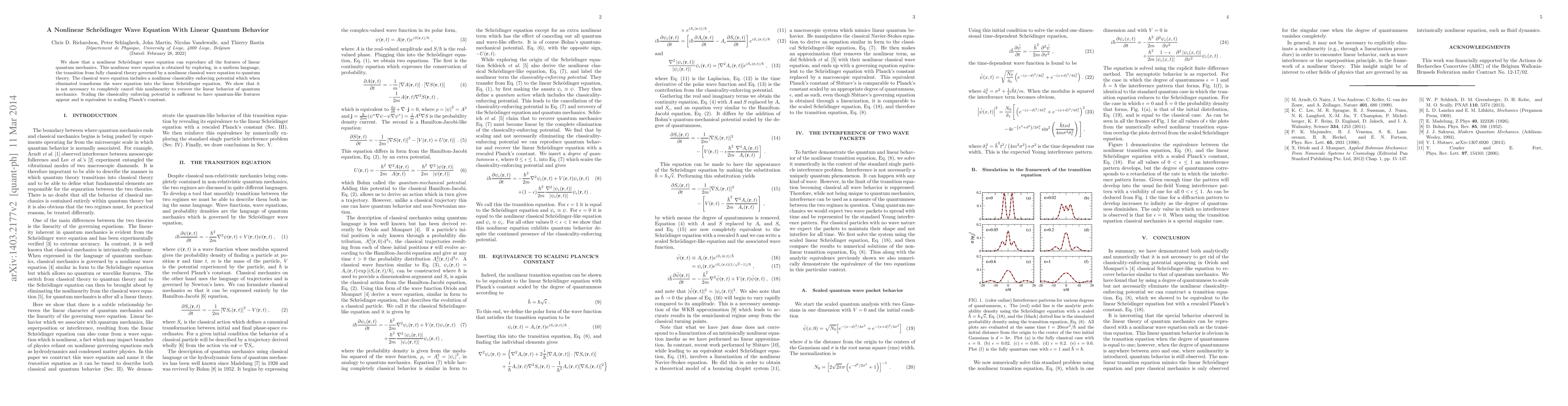 We show that a nonlinear Schr\"odinger wave equation can reproduce all the features of linear quantum mechanics. This nonlinear wave equation is obtained by exploring, in a uniform language, the transition from fully classical theory governed by a nonlinear classical wave equation to quantum theory. The classical wave equation includes a nonlinear classicality enforcing potential which when eliminated transforms the wave equation into the linear Schr\"odinger equation. We show that it is not necessary to completely cancel this nonlinearity to recover the linear behavior of quantum mechanics. Scaling the classicality enforcing potential is sufficient to have quantum-like features appear and is equivalent to scaling Planck's constant.