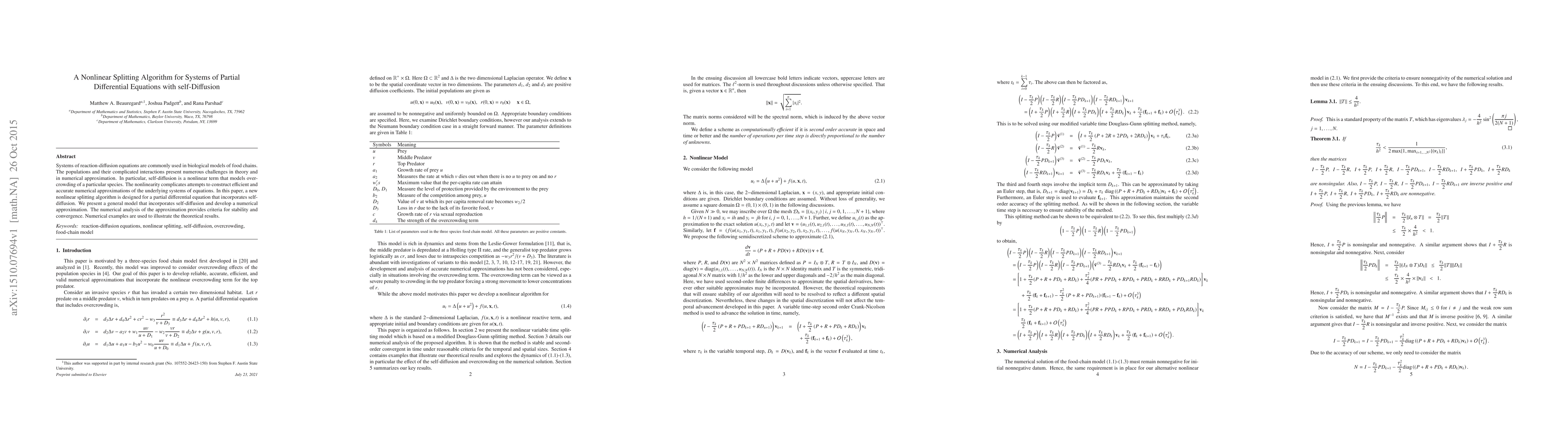 Systems of reaction-diffusion equations are commonly used in biological models of food chains. The populations and their complicated interactions present numerous challenges in theory and in numerical approximation. In particular, self-diffusion is a nonlinear term that models overcrowding of a particular species. The nonlinearity complicates attempts to construct efficient and accurate numerical approximations of the underlying systems of equations. In this paper, a new nonlinear splitting algorithm is designed for a partial differential equation that incorporates self-diffusion. We present a general model that incorporates self-diffusion and develop a numerical approximation. The numerical analysis of the approximation provides criteria for stability and convergence. Numerical examples are used to illustrate the theoretical results.