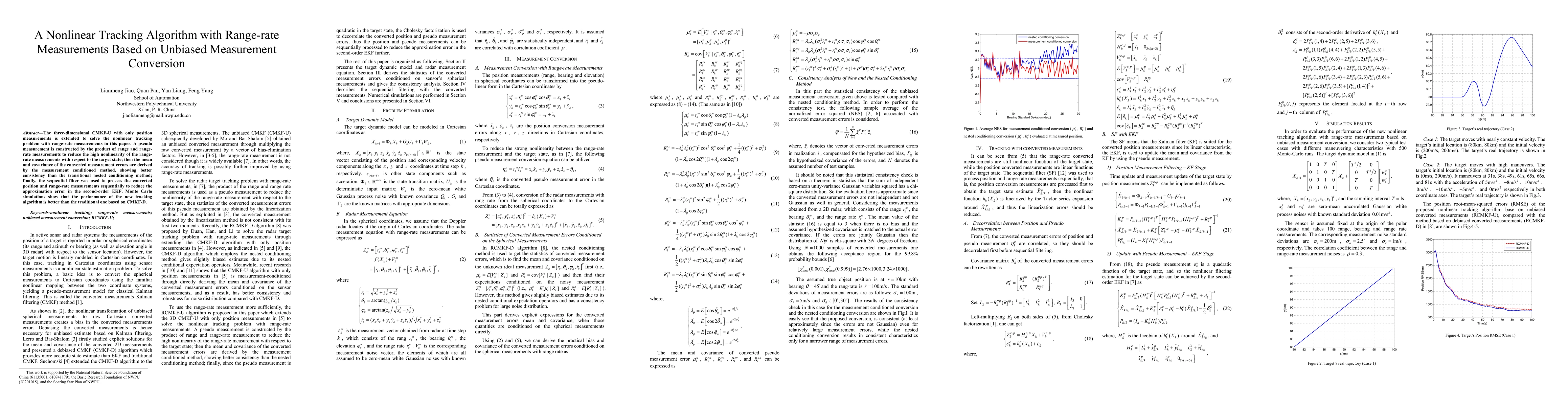 The three-dimensional CMKF-U with only position measurements is extended to solve the nonlinear tracking problem with range-rate measurements in this paper. A pseudo measurement is constructed by the product of range and range-rate measurements to reduce the high nonlinearity of the range-rate measurements with respect to the target state; then the mean and covariance of the converted measurement errors are derived by the measurement conditioned method, showing better consistency than the transitional nested conditioning method; finally, the sequential filter was used to process the converted position and range-rate measurements sequentially to reduce the approximation error in the second-order EKF. Monte Carlo simulations show that the performance of the new tracking algorithm is better than the traditional one based on CMKF-D.