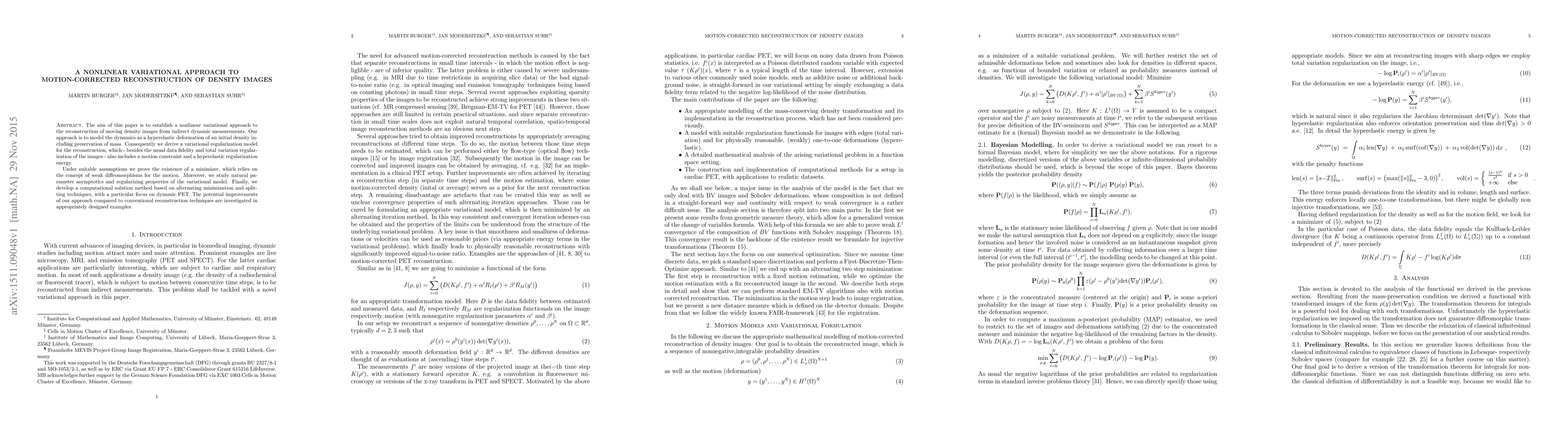 The aim of this paper is to establish a nonlinear variational approach to the reconstruction of moving density images from indirect dynamic measurements. Our approach is to model the dynamics as a hyperelastic deformation of an initial density including preservation of mass. Consequently we derive a variational regularization model for the reconstruction, which - besides the usual data fidelity and total variation regularization of the images - also includes a motion constraint and a hyperelastic regularization energy. Under suitable assumptions we prove the existence of a minimizer, which relies on the concept of weak diffeomorphisms for the motion. Moreover, we study natural parameter asymptotics and regularizing properties of the variational model. Finally, we develop a computational solution method based on alternating minimization and splitting techniques, with a particular focus on dynamic PET. The potential improvements of our approach compared to conventional reconstruction techniques are investigated in appropriately designed examples.