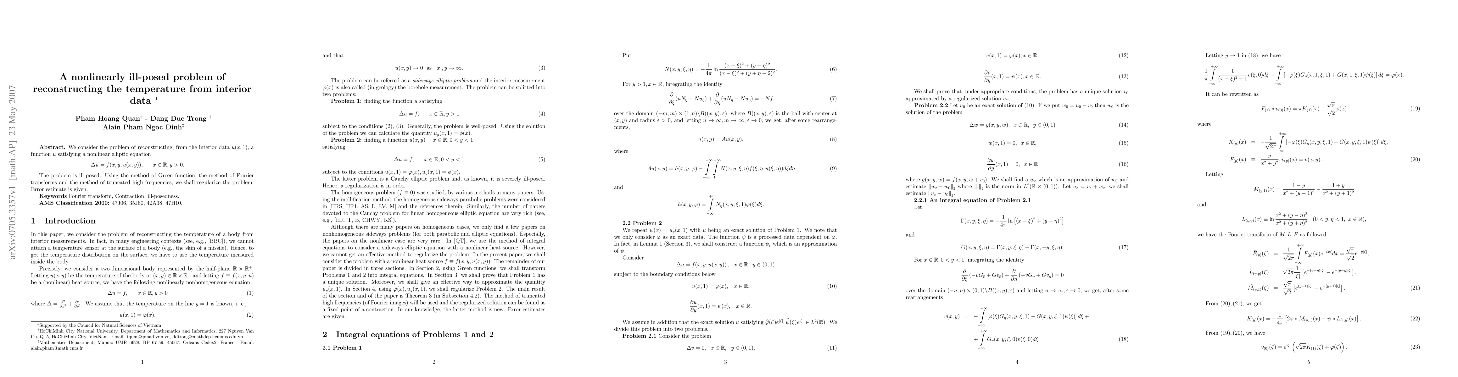 This research investigates the challenge of reconstructing a temperature function from limited interior data, which satisfies a complex nonlinear elliptic equation. The study introduces a method to tackle this 'nonlinearly ill-posed problem', providing insights into potential applications in fields dealing with such intricate mathematical models.