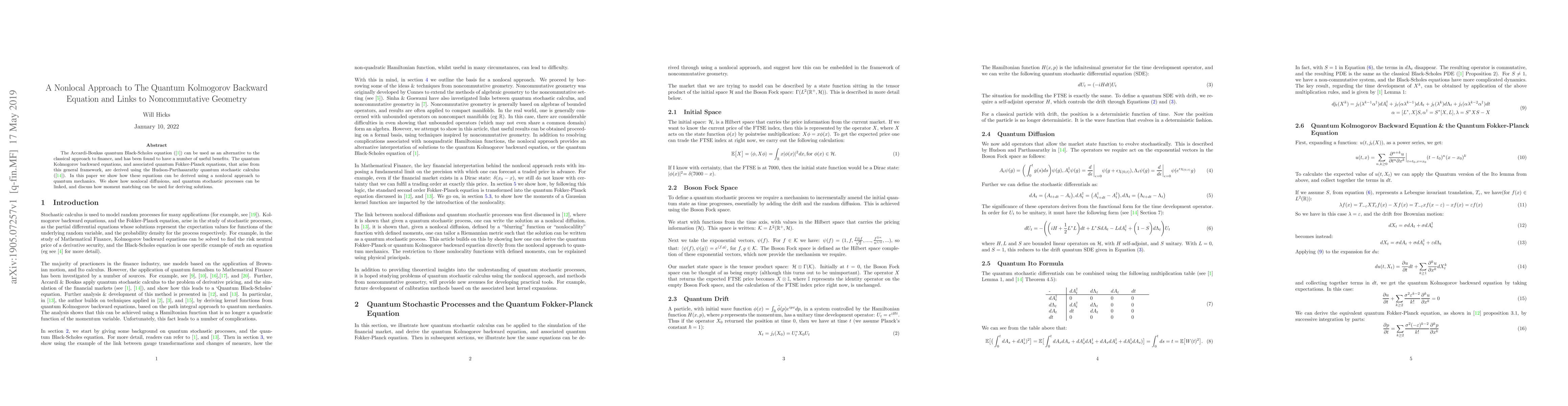 The Accardi-Boukas quantum Black-Scholes equation can be used as an alternative to the classical approach to finance, and has been found to have a number of useful benefits. The quantum Kolmogorov backward equations, and associated quantum Fokker-Planck equations, that arise from this general framework, are derived using the Hudson-Parthasarathy quantum stochastic calculus. In this paper we show how these equations can be derived using a nonlocal approach to quantum mechanics. We show how nonlocal diffusions, and quantum stochastic processes can be linked, and discuss how moment matching can be used for deriving solutions.