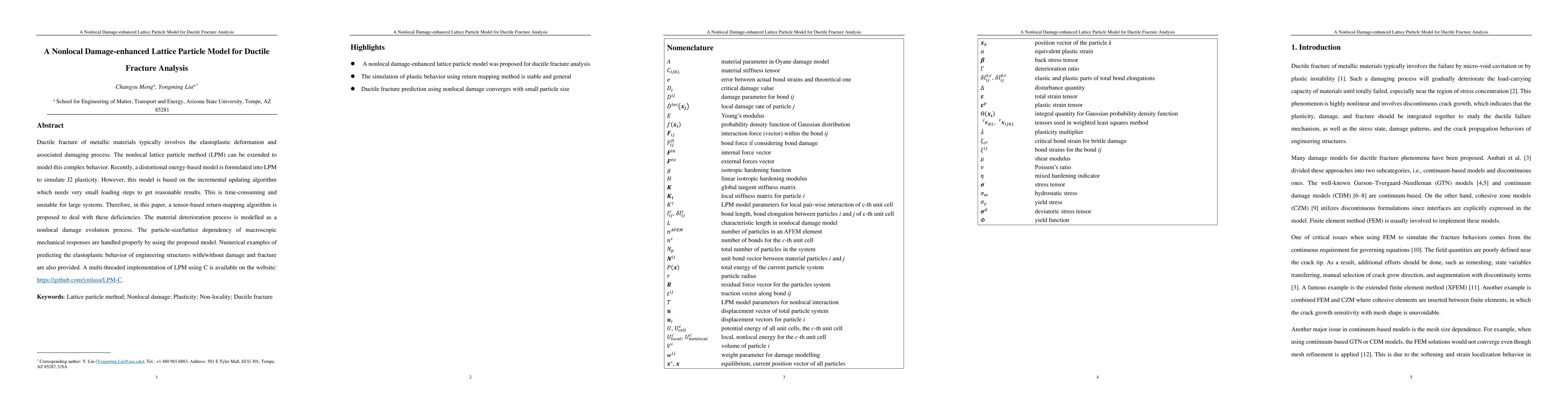 This paper proposes a tensor-based return-mapping algorithm to enhance the nonlocal lattice particle model (LPM) for simulating ductile fracture in metallic materials, addressing the incremental updating algorithm's limitations. The model effectively captures nonlocal damage evolution and mitigates particle-size/lattice dependency issues.