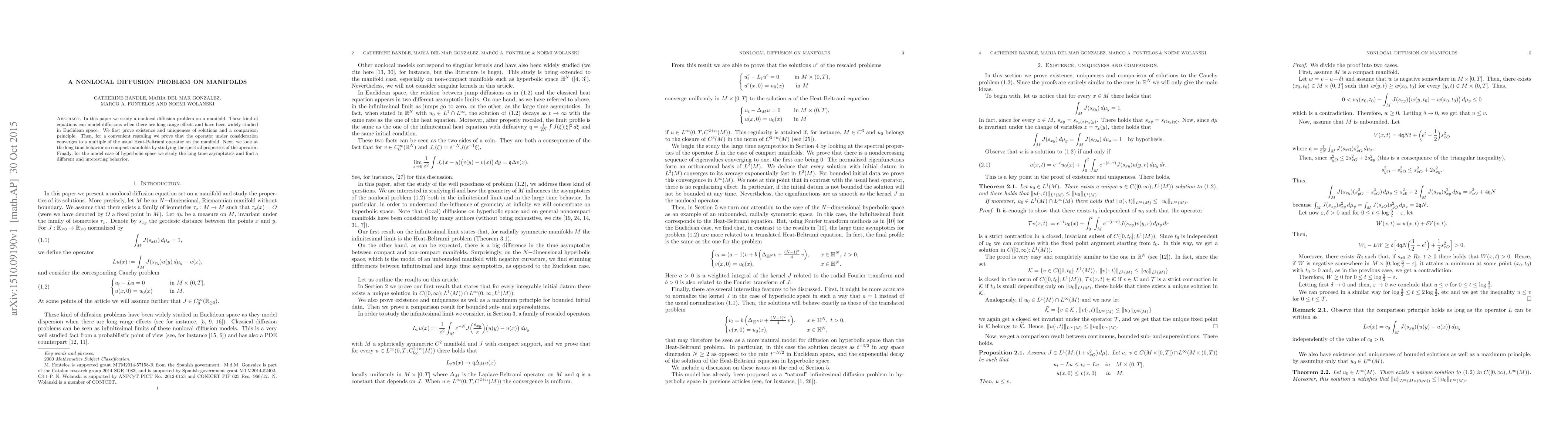 In this paper we study a nonlocal diffusion problem on a manifold. These kind of equations can model diffusions when there are long range effects and have been widely studied in Euclidean space. We first prove existence and uniqueness of solutions and a comparison principle. Then, for a convenient rescaling we prove that the operator under consideration converges to a multiple of the usual Heat-Beltrami operator on the manifold. Next, we look at the long time behavior on compact manifolds by studying the spectral properties of the operator. Finally, for the model case of hyperbolic space we study the long time asymptotics and find a different and interesting behavior.