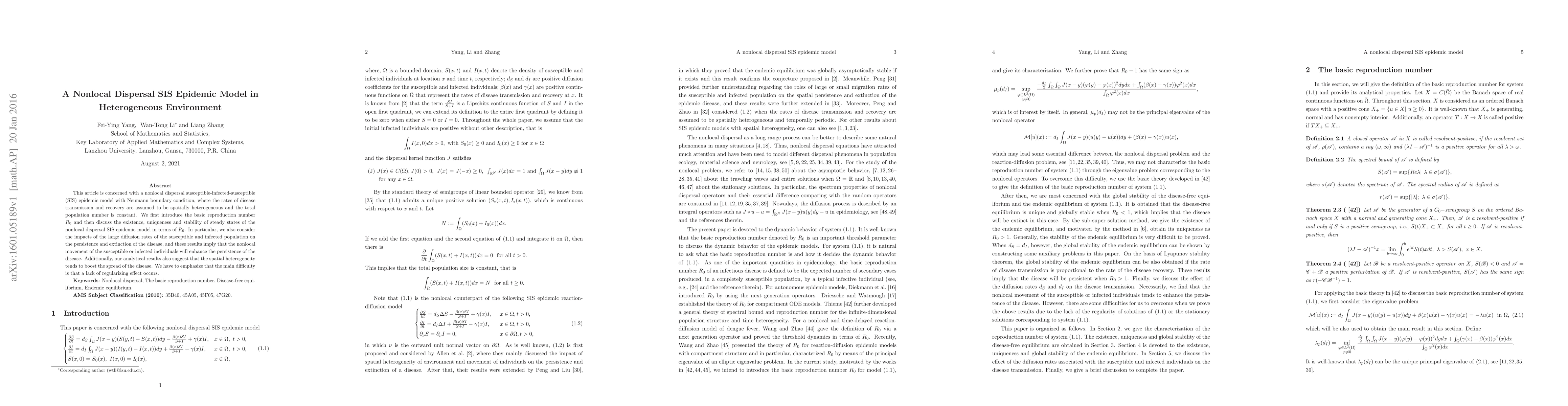 This paper explores a nonlocal dispersal SIS epidemic model with spatially heterogeneous transmission and recovery rates, analyzing the basic reproduction number $R_0$ to determine steady state existence, uniqueness, and stability. The study finds that high diffusion rates enhance disease persistence, and spatial heterogeneity promotes disease spread, despite the absence of regularizing effects.