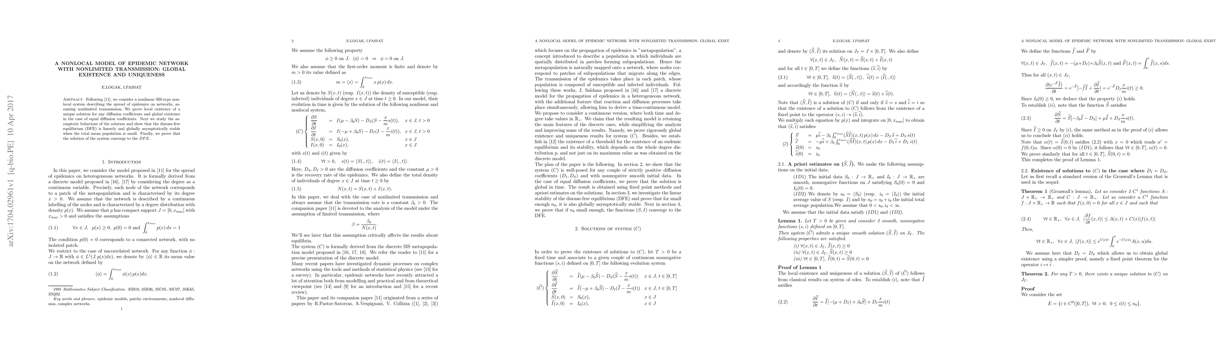 Following \cite{ipel1}, we consider a nonlinear SIS-type nonlocal system describing the spread of epidemics on networks, assuming nonlimited transmission, We prove local existence of a unique solution for any diffusion coefficients and global existence in the case of equal diffusion coefficients. Next we study the asymptotic behaviour of the solution and show that the disease-free equilibrium (DFE) is linearly and globally asymptotically stable when the total mean population is small. Finally, we prove that the solution of the system converge to the $DFE$.