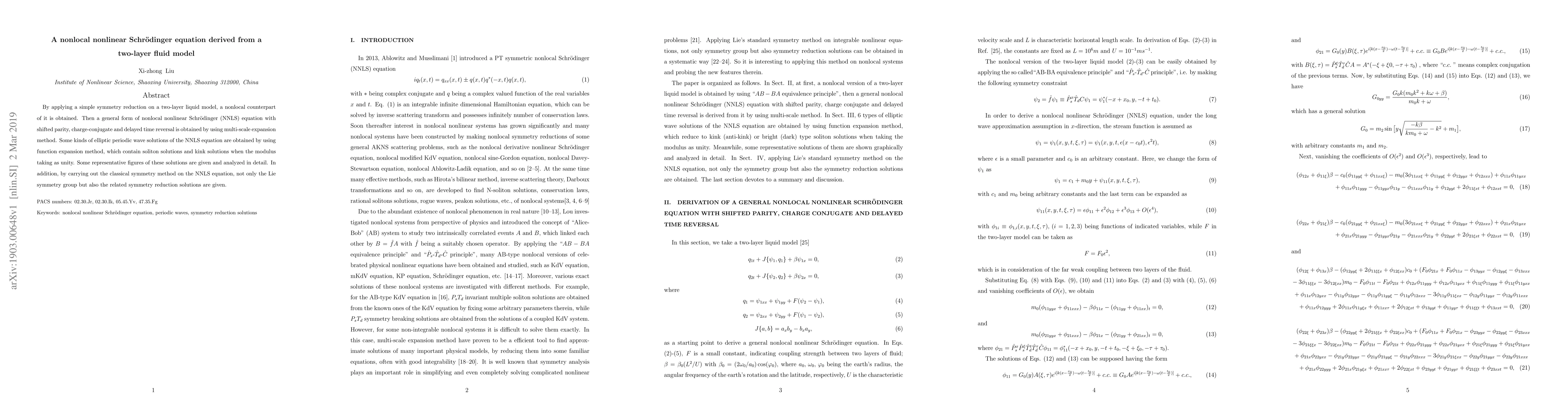 By applying a simple symmetry reduction on a two-layer liquid model, a nonlocal counterpart of it is obtained. Then a general form of nonlocal nonlinear Schrodinger (NNLS) equation with shifted parity, charge-conjugate and delayed time reversal is obtained by using multi-scale expansion method. Some kinds of elliptic periodic wave solutions of the NNLS equation are obtained by using function expansion method, which contain soliton solutions and kink solutions when the modulus taking as unity. Some representative figures of these solutions are given and analyzed in detail. In addition, by carrying out the classical symmetry method on the NNLS equation, not only the Lie symmetry group but also the related symmetry reduction solutions are given.