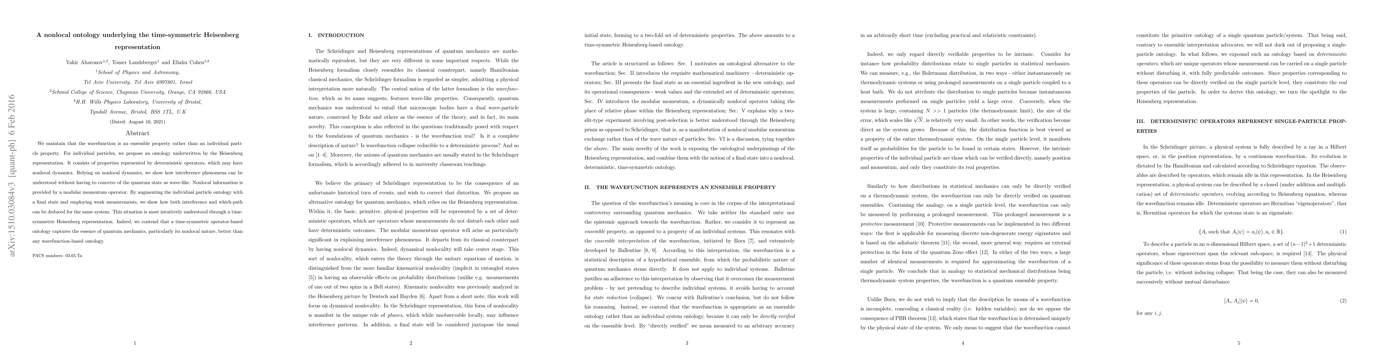 We maintain that the wavefunction is an ensemble property rather than an individual particle property. For individual particles, we propose an ontology underwritten by the Heisenberg representation. It consists of properties represented by deterministic operators, which may have nonlocal dynamics. Relying on nonlocal dynamics, we show how interference phenomena can be understood without having to conceive of the quantum state as wave-like. Nonlocal information is provided by a modular momentum operator. By augmenting the individual particle ontology with a final state and employing weak measurements, we show how both interference and which-path can be deduced for the same system. This situation is most intuitively understood through a time-symmetric Heisenberg representation. Indeed, we contend that a time-symmetric operator-based ontology captures the essence of quantum mechanics, particularly its nonlocal nature, better than any wavefunction-based ontology.