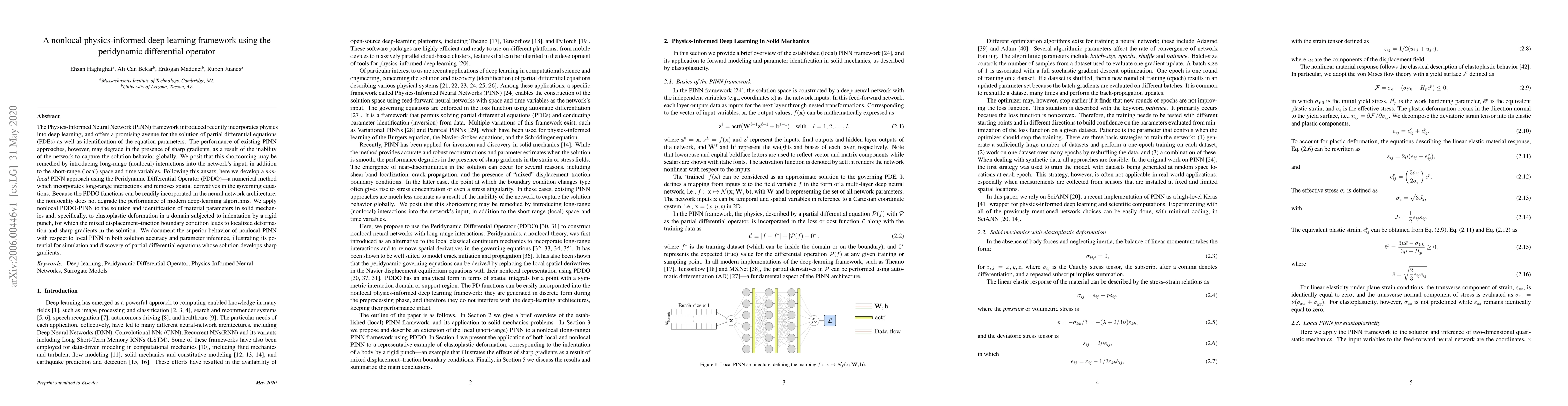 The Physics-Informed Neural Network (PINN) framework introduced recently incorporates physics into deep learning, and offers a promising avenue for the solution of partial differential equations (PDEs) as well as identification of the equation parameters. The performance of existing PINN approaches, however, may degrade in the presence of sharp gradients, as a result of the inability of the network to capture the solution behavior globally. We posit that this shortcoming may be remedied by introducing long-range (nonlocal) interactions into the network's input, in addition to the short-range (local) space and time variables. Following this ansatz, here we develop a nonlocal PINN approach using the Peridynamic Differential Operator (PDDO)---a numerical method which incorporates long-range interactions and removes spatial derivatives in the governing equations. Because the PDDO functions can be readily incorporated in the neural network architecture, the nonlocality does not degrade the performance of modern deep-learning algorithms. We apply nonlocal PDDO-PINN to the solution and identification of material parameters in solid mechanics and, specifically, to elastoplastic deformation in a domain subjected to indentation by a rigid punch, for which the mixed displacement--traction boundary condition leads to localized deformation and sharp gradients in the solution. We document the superior behavior of nonlocal PINN with respect to local PINN in both solution accuracy and parameter inference, illustrating its potential for simulation and discovery of partial differential equations whose solution develops sharp gradients.