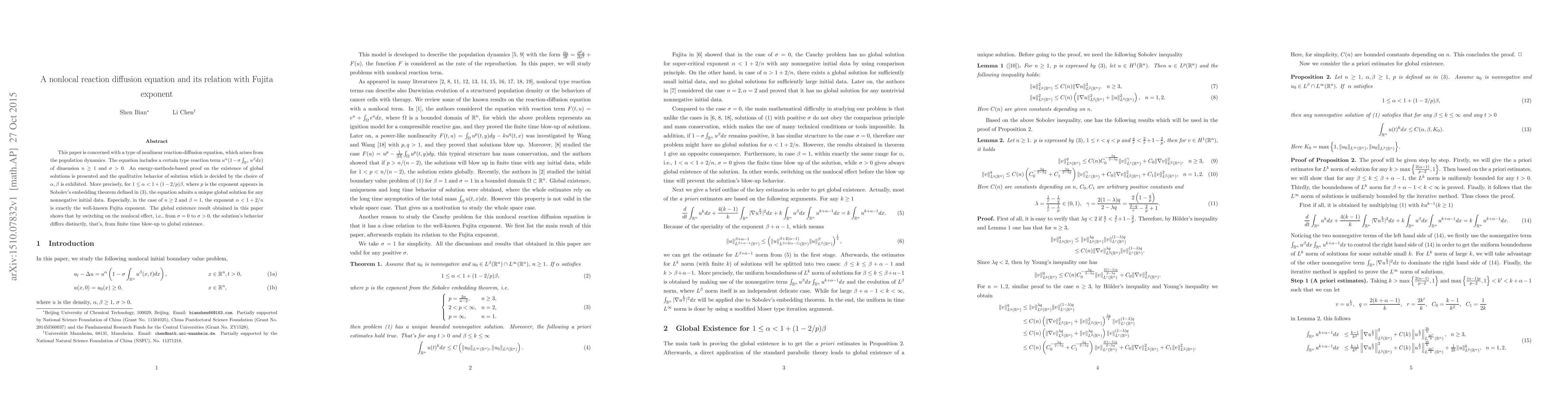This paper is concerned with a type of nonlinear reaction-diffusion equation, which arises from the population dynamics. The equation includes a certain type reaction term $u^\alpha(1- \sigma \int_{\R^n}u^\beta dx)$ of dimension $n \ge 1$ and $\sigma>0$. An energy-methods-based proof on the existence of global solutions is presented and the qualitative behavior of solution which is decided by the choice of $\alpha,\beta$ is exhibited. More precisely, for $1 \le \alpha<1+(1-2/p)\beta$, where $p$ is the exponent appears in Sobolev's embedding theorem defined in \er{p}, the equation admits a unique global solution for any nonnegative initial data. Especially, in the case of $n\geq 2$ and $\beta=1$, the exponent $\alpha<1+2/n$ is exactly the well-known Fujita exponent. The global existence result obtained in this paper shows that by switching on the nonlocal effect, i.e., from $\sigma=0$ to $\sigma>0$, the solution's behavior differs distinctly, that's, from finite time blow-up to global existence.