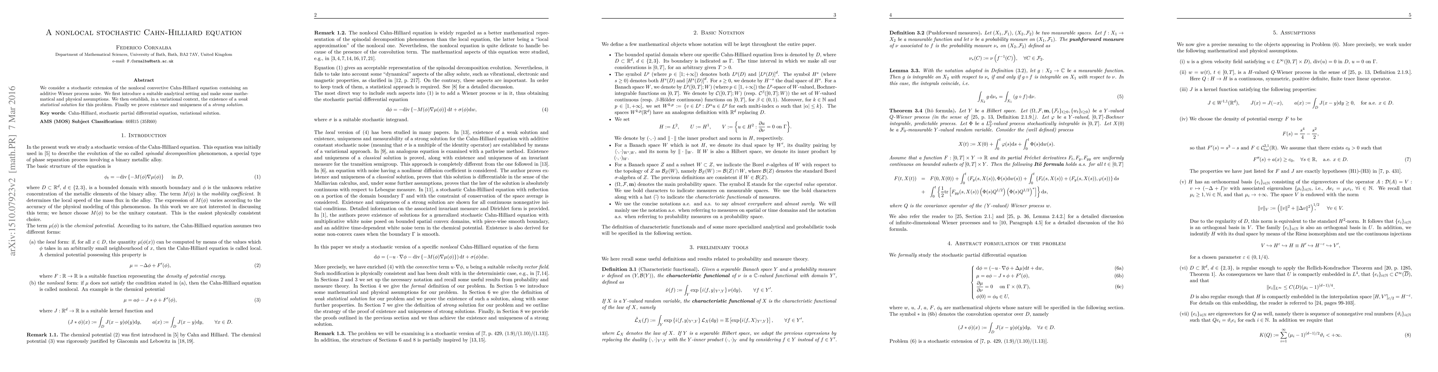 This paper extends the nonlocal convective Cahn-Hilliard equation to a stochastic setting with Wiener process noise, establishing the existence of both weak statistical and strong solutions under appropriate assumptions.