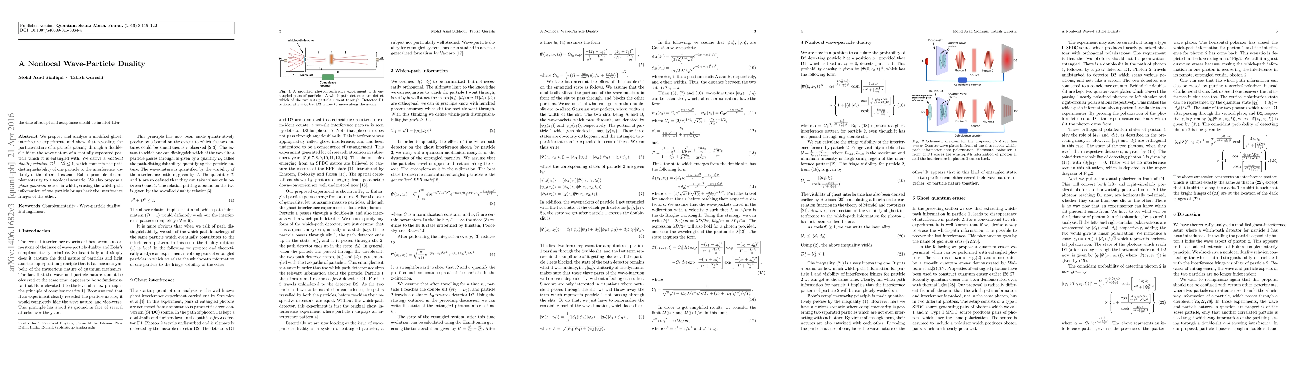 This paper proposes a modified ghost-interference experiment demonstrating nonlocal wave-particle duality, where revealing one entangled particle's path distinguishes the other's wave nature. It derives a nonlocal duality relation extending Bohr's complementarity to a nonlocal context and suggests a ghost quantum eraser to restore interference fringes.