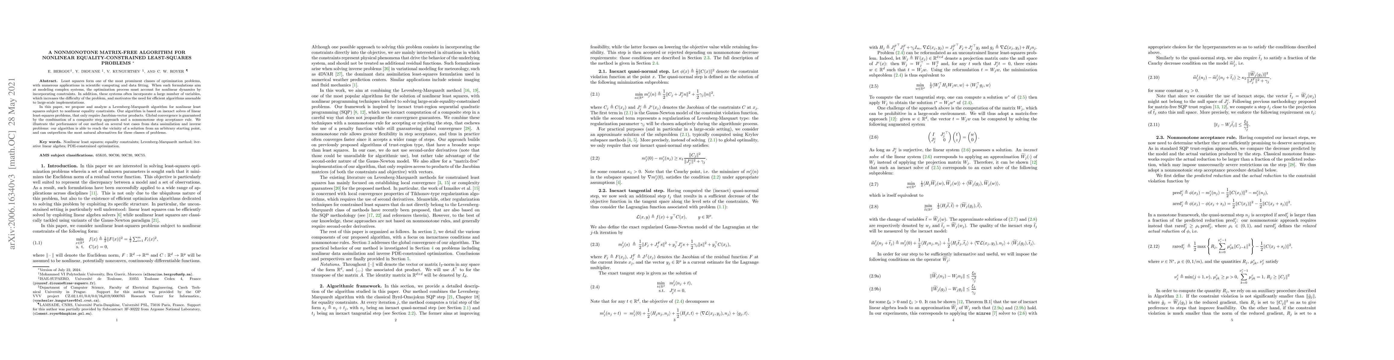 This paper proposes a matrix-free Levenberg-Marquardt algorithm for solving nonlinear least squares problems with equality constraints, relying on Jacobian-vector products. The algorithm uses a composite step approach and a nonmonotone step acceptance rule to ensure global convergence and efficiency for large-scale problems.
