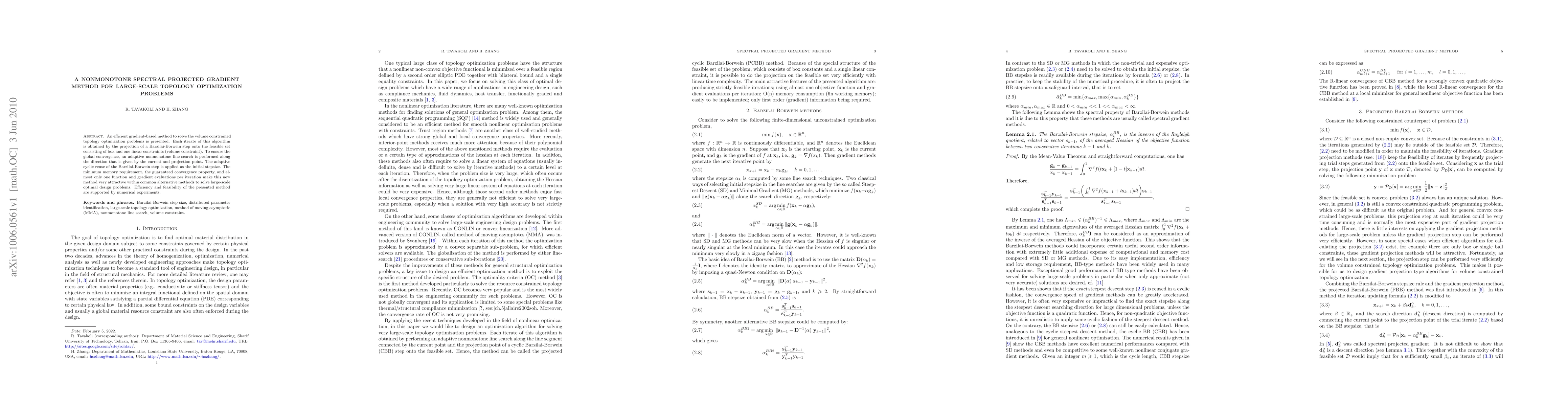 This paper presents a nonmonotone spectral projected gradient method for large-scale topology optimization, utilizing a Barzilai-Borwein step and adaptive nonmonotone line search for global convergence. The method's efficiency is demonstrated through minimal memory requirements and strong numerical performance.