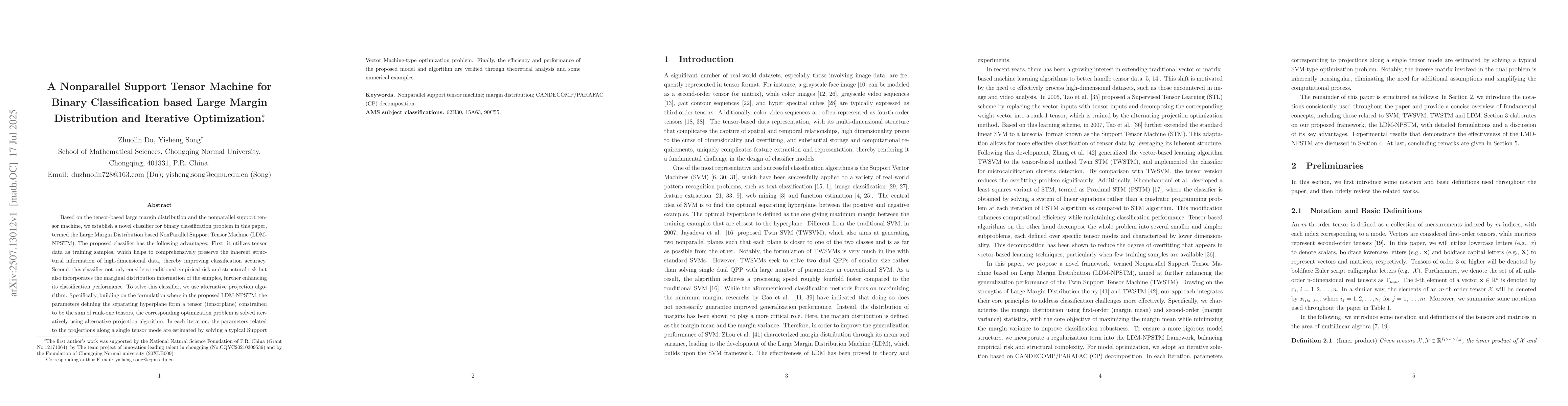Based on the tensor-based large margin distribution and the nonparallel support tensor machine, we establish a novel classifier for binary classification problem in this paper, termed the Large Margin Distribution based NonParallel Support Tensor Machine (LDM-NPSTM). The proposed classifier has the following advantages: First, it utilizes tensor data as training samples, which helps to comprehensively preserve the inherent structural information of high-dimensional data, thereby improving classification accuracy. Second, this classifier not only considers traditional empirical risk and structural risk but also incorporates the marginal distribution information of the samples, further enhancing its classification performance. To solve this classifier, we use alternative projection algorithm. Specifically, building on the formulation where in the proposed LDM-NPSTM, the parameters defining the separating hyperplane form a tensor (tensorplane) constrained to be the sum of rank-one tensors, the corresponding optimization problem is solved iteratively using alternative projection algorithm. In each iteration, the parameters related to the projections along a single tensor mode are estimated by solving a typical Support Vector Machine-type optimization problem. Finally, the efficiency and performance of the proposed model and algorithm are verified through theoretical analysis and some numerical examples.