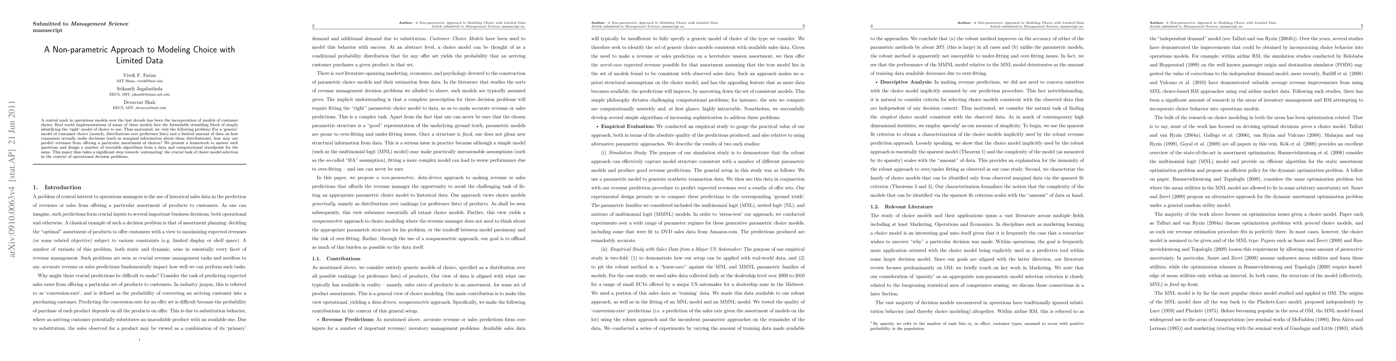 This paper presents a nonparametric approach to model consumer choice with limited data, aiming to predict revenues from product assortments. It introduces a framework and algorithms to automate the selection of choice models for operational decision-making.
