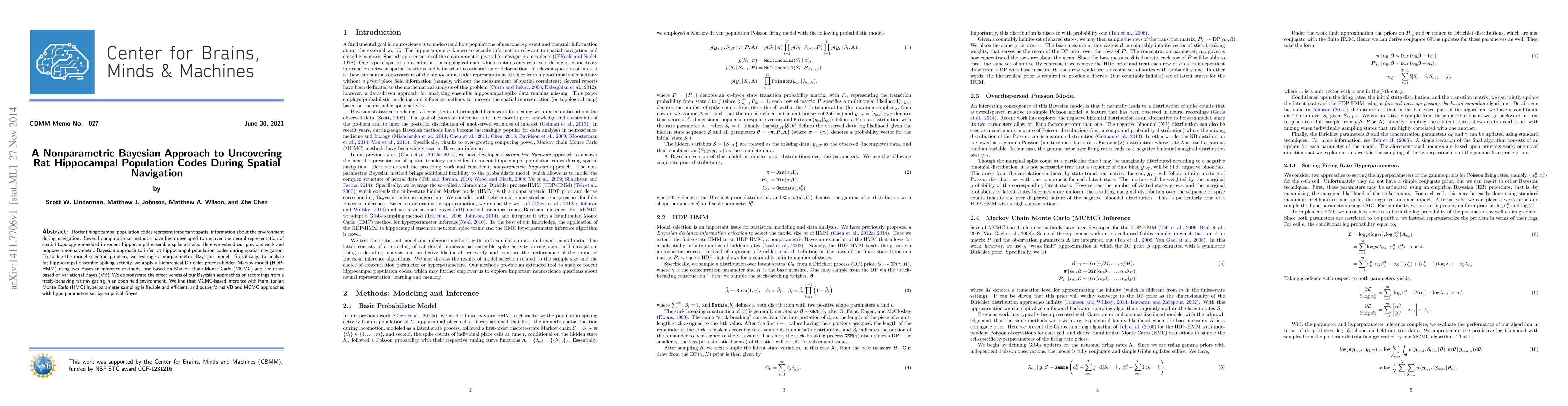 This paper proposes a nonparametric Bayesian approach using hierarchical Dirichlet process-hidden Markov models (HDP-HMM) to infer rat hippocampal population codes during spatial navigation. The study demonstrates the effectiveness of Markov chain Monte Carlo (MCMC) and variational Bayes (VB) inference methods, finding that MCMC with Hamiltonian Monte Carlo (HMC) outperforms other methods.