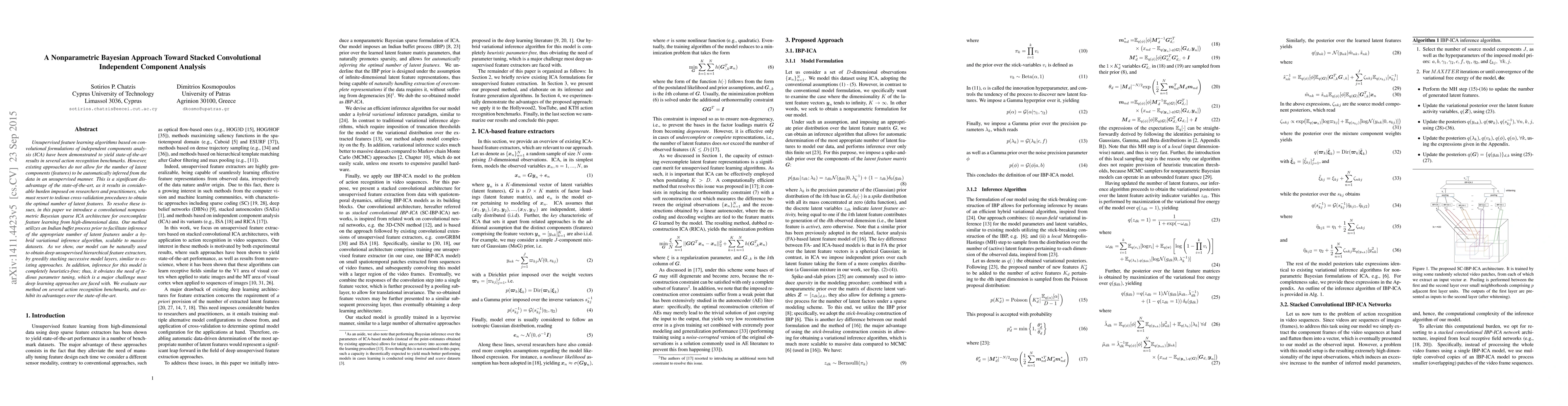 Unsupervised feature learning algorithms based on convolutional formulations of independent components analysis (ICA) have been demonstrated to yield state-of-the-art results in several action recognition benchmarks. However, existing approaches do not allow for the number of latent components (features) to be automatically inferred from the data in an unsupervised manner. This is a significant disadvantage of the state-of-the-art, as it results in considerable burden imposed on researchers and practitioners, who must resort to tedious cross-validation procedures to obtain the optimal number of latent features. To resolve these issues, in this paper we introduce a convolutional nonparametric Bayesian sparse ICA architecture for overcomplete feature learning from high-dimensional data. Our method utilizes an Indian buffet process prior to facilitate inference of the appropriate number of latent features under a hybrid variational inference algorithm, scalable to massive datasets. As we show, our model can be naturally used to obtain deep unsupervised hierarchical feature extractors, by greedily stacking successive model layers, similar to existing approaches. In addition, inference for this model is completely heuristics-free; thus, it obviates the need of tedious parameter tuning, which is a major challenge most deep learning approaches are faced with. We evaluate our method on several action recognition benchmarks, and exhibit its advantages over the state-of-the-art.