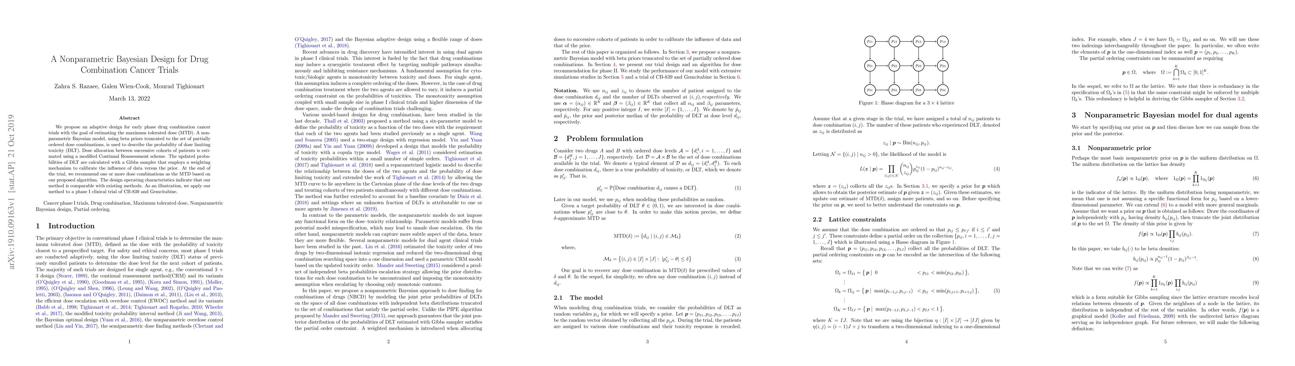 This paper proposes an adaptive nonparametric Bayesian design for early phase cancer drug combination trials to estimate the maximum tolerated dose (MTD). It utilizes a modified Continual Reassessment scheme and a Gibbs sampler to update dose-toxicity probabilities, ultimately recommending optimal dose combinations.