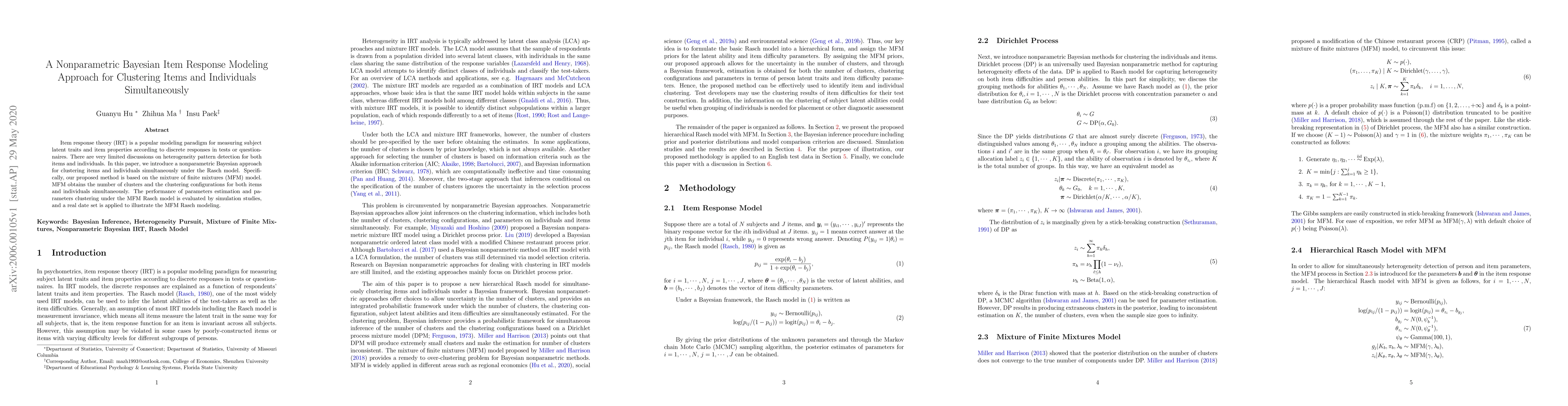 This paper proposes a nonparametric Bayesian approach based on the mixture of finite mixtures (MFM) model for simultaneously clustering items and individuals under the Rasch model in item response theory. The method estimates the number of clusters and configurations, and its performance is validated through simulation studies and a real dataset application.