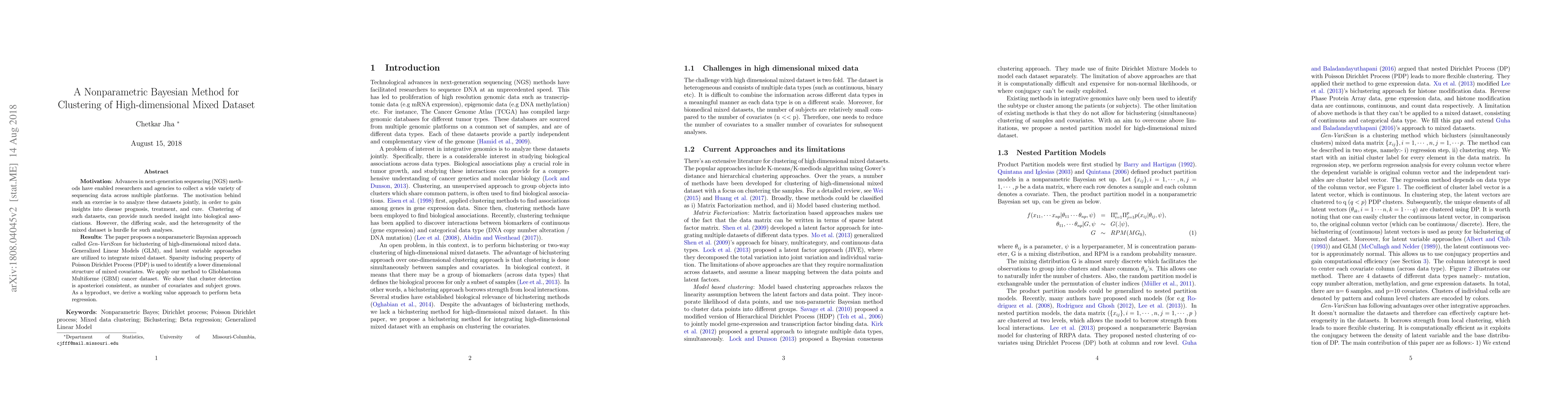 This paper proposes Gen-VariScan, a nonparametric Bayesian method for clustering high-dimensional mixed datasets using Generalized Linear Models and latent variable approaches. The method employs Poisson Dirichlet Process for identifying lower dimensional structures and demonstrates consistent covariate co-cluster detection.