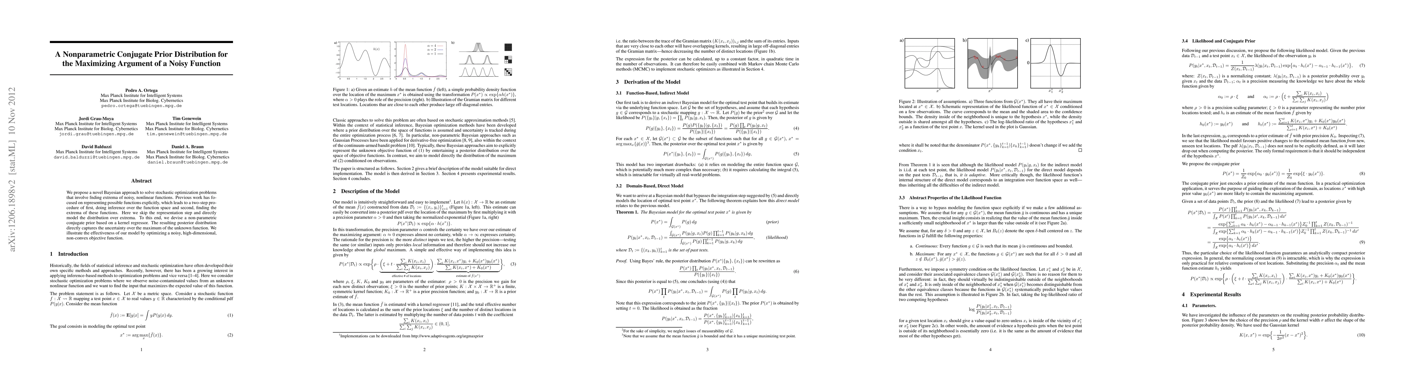 We propose a novel Bayesian approach to solve stochastic optimization problems that involve finding extrema of noisy, nonlinear functions. Previous work has focused on representing possible functions explicitly, which leads to a two-step procedure of first, doing inference over the function space and second, finding the extrema of these functions. Here we skip the representation step and directly model the distribution over extrema. To this end, we devise a non-parametric conjugate prior based on a kernel regressor. The resulting posterior distribution directly captures the uncertainty over the maximum of the unknown function. We illustrate the effectiveness of our model by optimizing a noisy, high-dimensional, non-convex objective function.