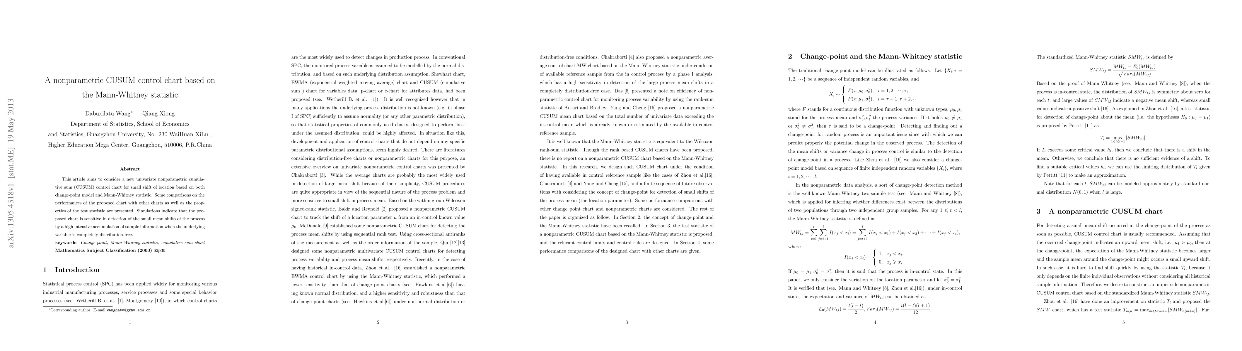 This article aims to consider a new univariate nonparametric cumulative sum (CUSUM) control chart for small shift of location based on both change-point model and Mann-Whitney statistic. Some comparisons on the performances of the proposed chart with other charts as well as the properties of the test statistic are presented. Simulations indicate that the proposed chart is sensitive in detection of the small mean shifts of the process by a high intensive accumulation of sample information when the underlying variable is completely distribution-free.