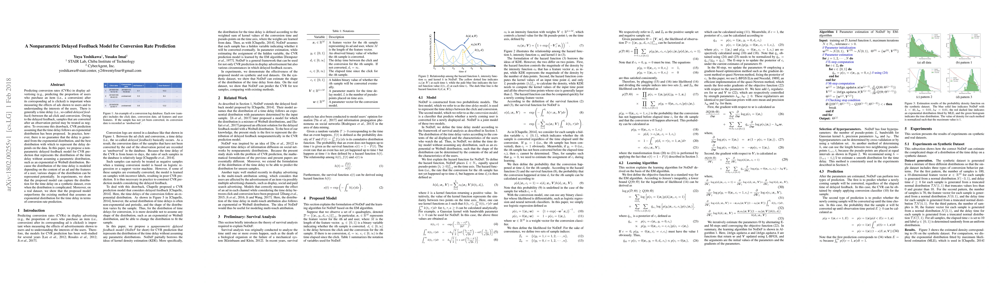 This paper proposes a nonparametric delayed feedback model for predicting conversion rates in display advertising, addressing the issue of time delay between ad clicks and conversions. Unlike existing methods that assume a parametric distribution for the delay, this model flexibly represents the delay distribution without such assumptions, leading to better performance on both synthetic and real datasets.