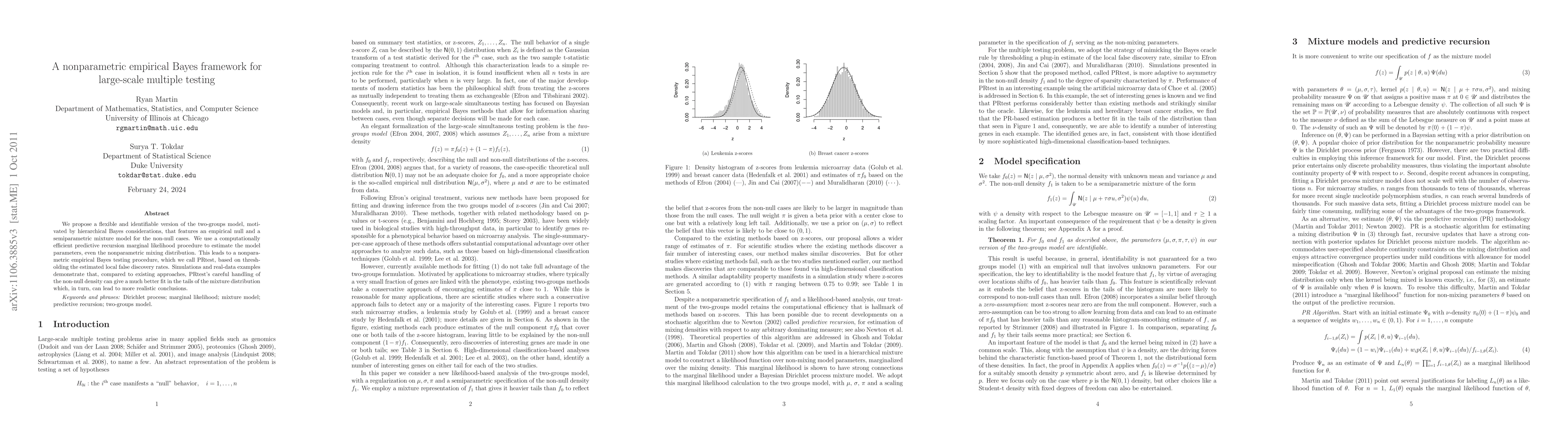 This paper proposes a nonparametric empirical Bayes framework, PRtest, for large-scale multiple testing, utilizing a semiparametric mixture model and a predictive recursion marginal likelihood procedure for parameter estimation. PRtest effectively handles the non-null density, leading to more realistic conclusions compared to existing methods.