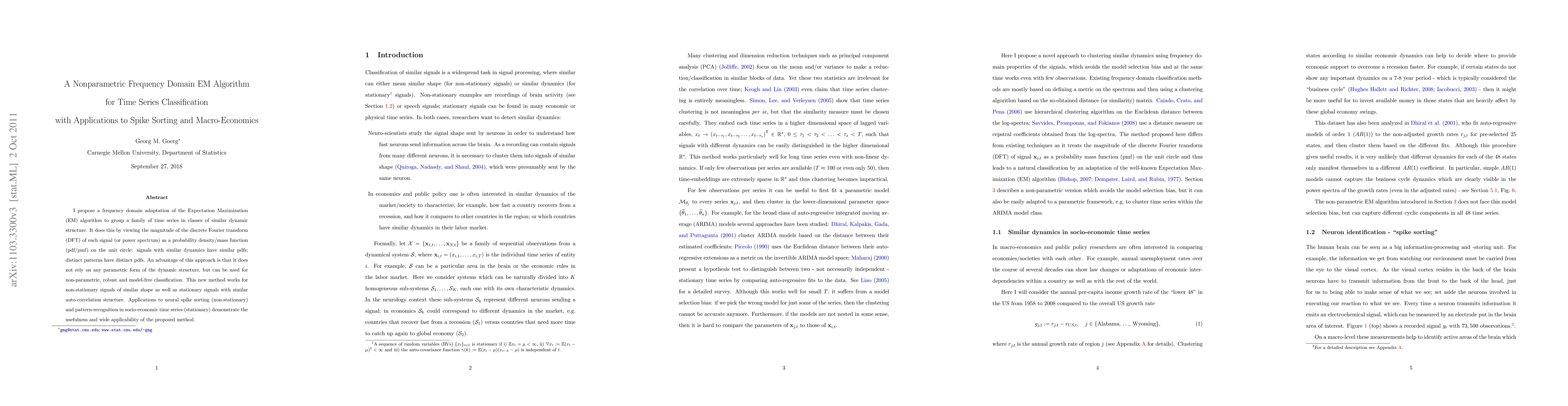 This research introduces a nonparametric, frequency domain Expectation Maximization (EM) algorithm for classifying time series based on their dynamic structure, without relying on specific parametric models. It uses the discrete Fourier transform's magnitude as a probability distribution on the unit circle, making it suitable for non-stationary and stationary signals. The method is demonstrated to be effective in neural spike sorting and socio-economic time series analysis.