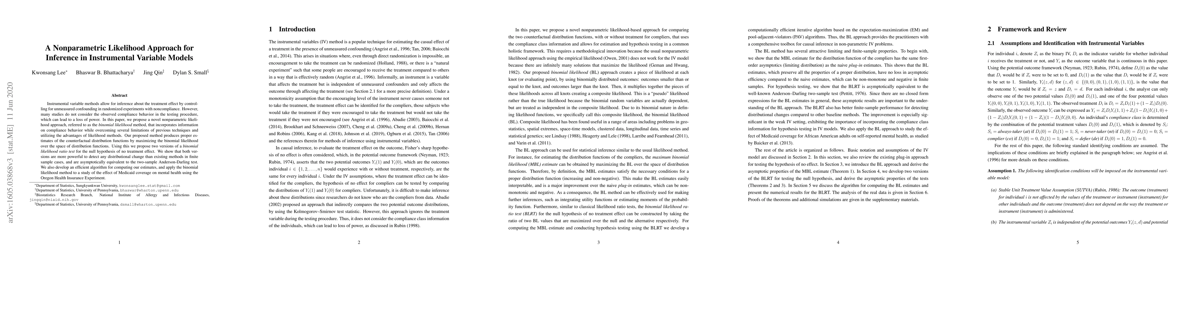 This paper introduces a novel nonparametric likelihood approach, the binomial likelihood method, to improve inference in instrumental variable models by incorporating compliance behavior. The proposed method is shown to be more powerful and efficient than existing techniques, demonstrated through an application to Medicaid coverage's effect on mental health.