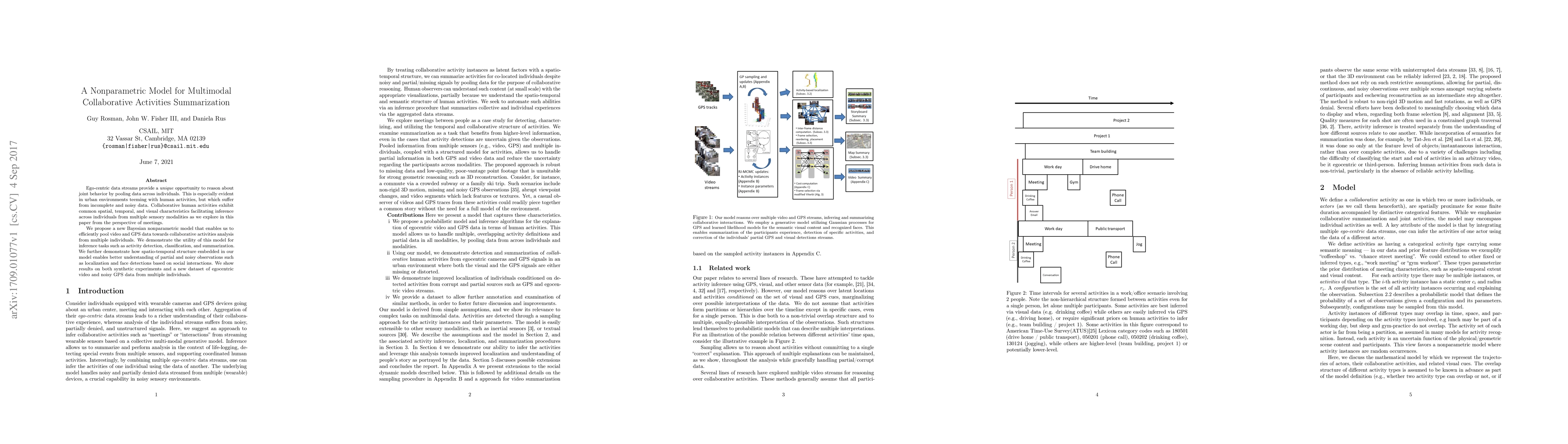 This paper proposes a Bayesian nonparametric model for analyzing multimodal collaborative activities using pooled ego-centric data streams. The model efficiently integrates video and GPS data to infer activities, detect patterns, and summarize collaborative behaviors, even with noisy observations.
