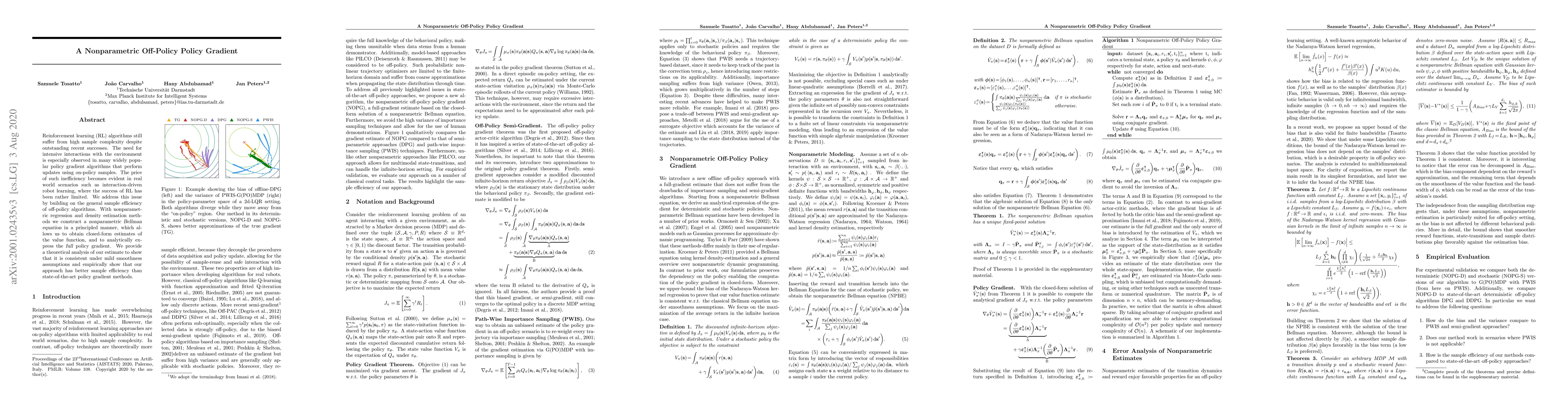 This paper presents a nonparametric off-policy policy gradient method to improve the sample efficiency of reinforcement learning algorithms. By leveraging nonparametric regression and density estimation, it constructs a nonparametric Bellman equation, achieving closed-form value function estimates and policy gradients, which are shown to be consistent and outperform existing on-policy methods in sample efficiency.