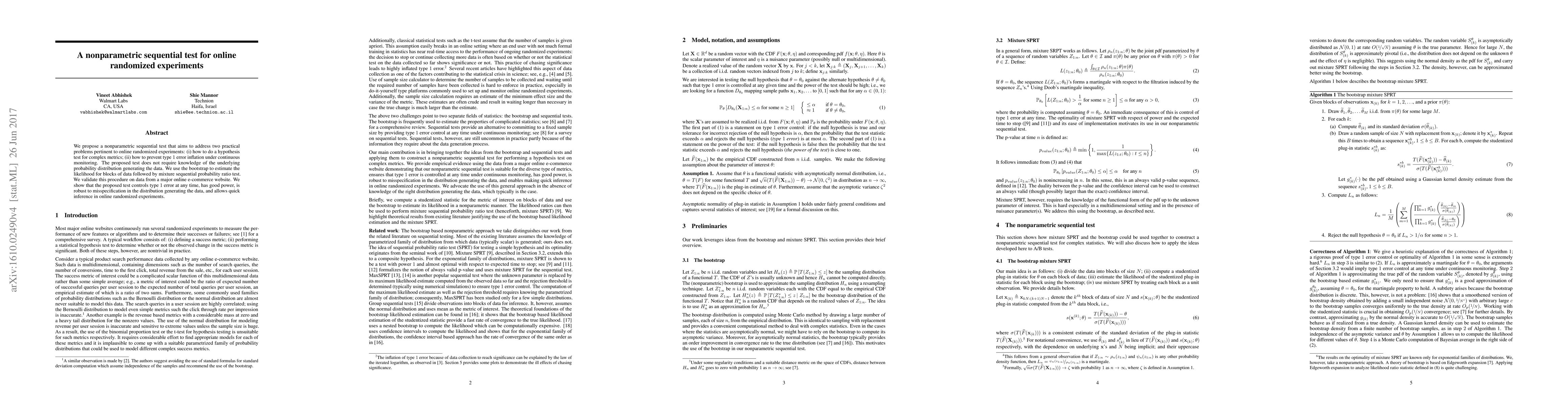 We propose a nonparametric sequential test that aims to address two practical problems pertinent to online randomized experiments: (i) how to do a hypothesis test for complex metrics; (ii) how to prevent type $1$ error inflation under continuous monitoring. The proposed test does not require knowledge of the underlying probability distribution generating the data. We use the bootstrap to estimate the likelihood for blocks of data followed by mixture sequential probability ratio test. We validate this procedure on data from a major online e-commerce website. We show that the proposed test controls type $1$ error at any time, has good power, is robust to misspecification in the distribution generating the data, and allows quick inference in online randomized experiments.