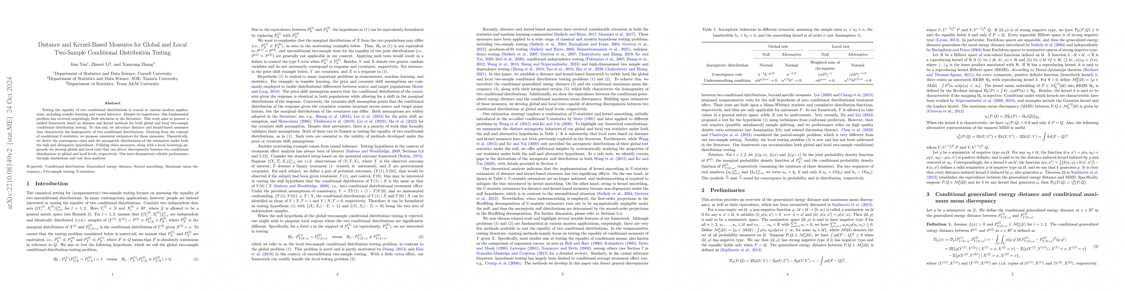This paper introduces a new nonparametric measure, the conditional energy distance (CED), to assess the equality of two conditional distributions without requiring parametric assumptions. The authors develop a two-sample test based on CED, supported by a local bootstrap method for accurate p-value estimation, and demonstrate its effectiveness through simulations and real data analysis.