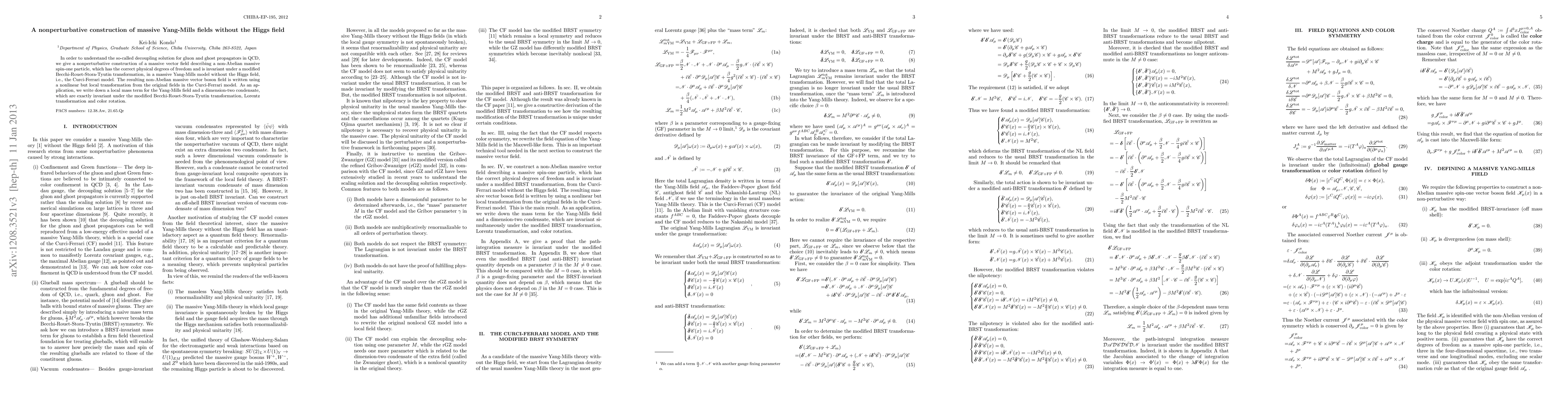 This paper presents a nonperturbative method to construct massive Yang-Mills fields without Higgs fields, focusing on the Curci-Ferrari model. It develops a massive vector field invariant under a modified BRST transformation, providing a local mass term and a dimension-two condensate that maintain invariance under Lorentz and color transformations.