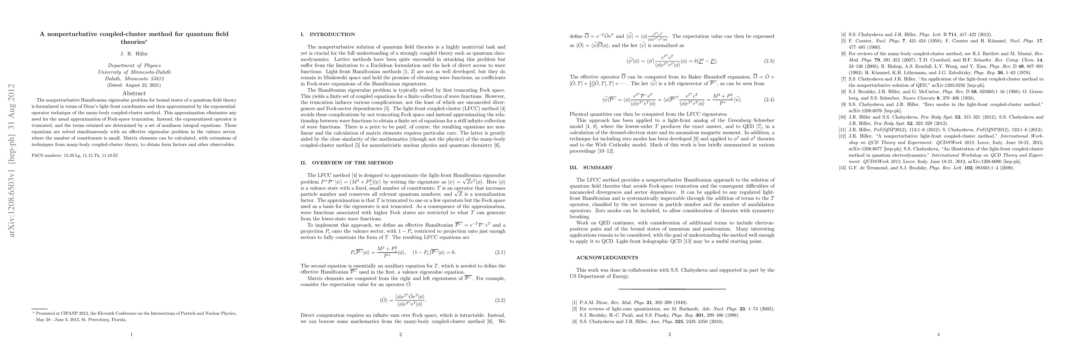 The nonperturbative Hamiltonian eigenvalue problem for bound states of a quantum field theory is formulated in terms of Dirac's light-front coordinates and then approximated by the exponential-operator technique of the many-body coupled-cluster method. This approximation eliminates any need for the usual approximation of Fock-space truncation. Instead, the exponentiated operator is truncated, and the terms retained are determined by a set of nonlinear integral equations. These equations are solved simultaneously with an effective eigenvalue problem in the valence sector, where the number of constituents is small. Matrix elements can be calculated, with extensions of techniques from many-body coupled-cluster theory, to obtain form factors and other observables.